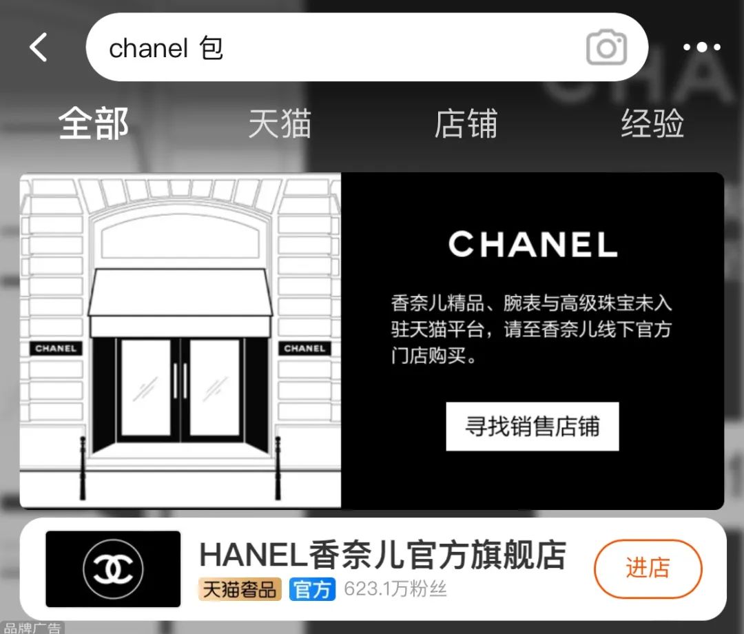 比如Hermes、Dior、CHANEL在天猫的旗舰店均为香水美妆店,包袋系列并没有官方旗舰店。如果以“CHANEL 包”为搜索词,CHANEL会直接提示“精品、腕表与高级珠宝未入驻天猫,请去线下门店购买。”