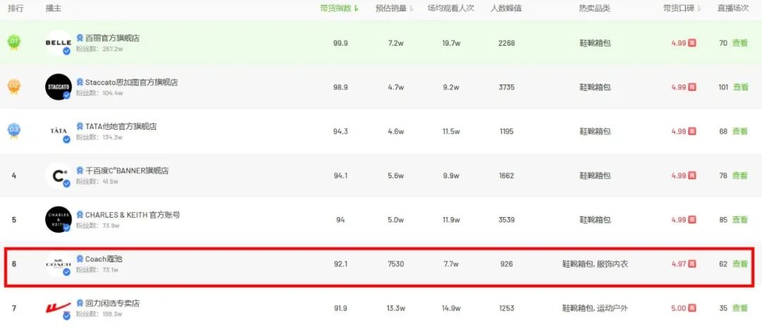 在重要节日如圣诞、新年或双11大促等节点,COACH还会进行长达16小时的超长直播,单场销售额最佳成绩超过100万。与此同时,品牌进入了飞瓜数据3月鞋靴箱包类品牌直播带货榜TOP 10,成为唯一入围的奢侈品牌。