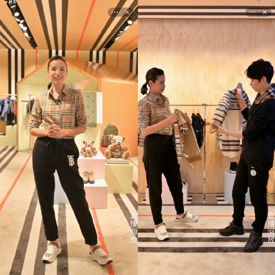 以Linda为Burberry的亲子风尚主题专场为例,两位主播位于上海南京西路恒隆广场的品牌童装店开播,店内灯光以暖黄色为主基调,观感更为舒适,两位主播有走动空间,而非仅在固定镜头前进行展示,介绍产品时更加强调品牌历史、设计元素,同时更加注重产品之间的呼应与搭配。