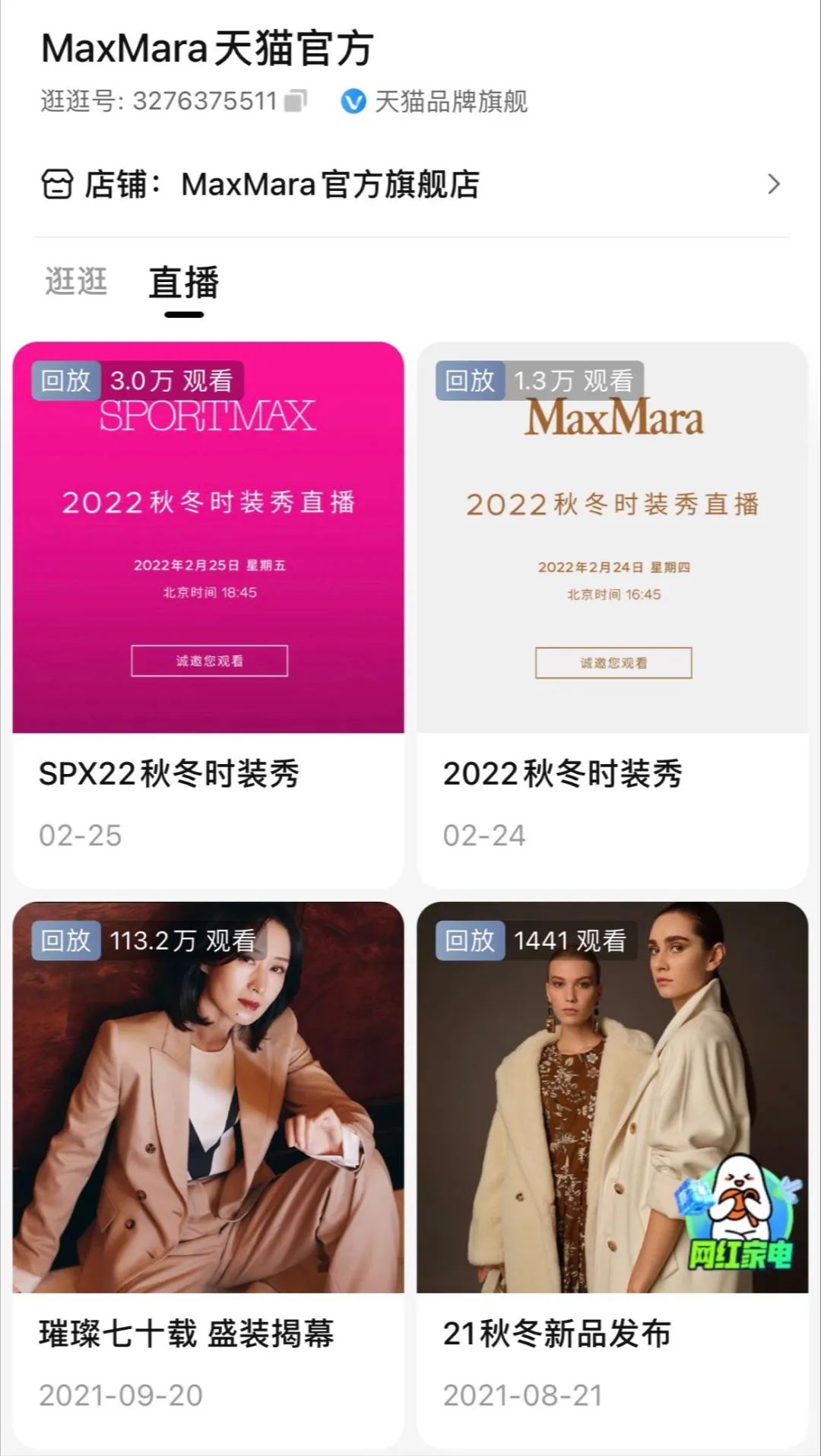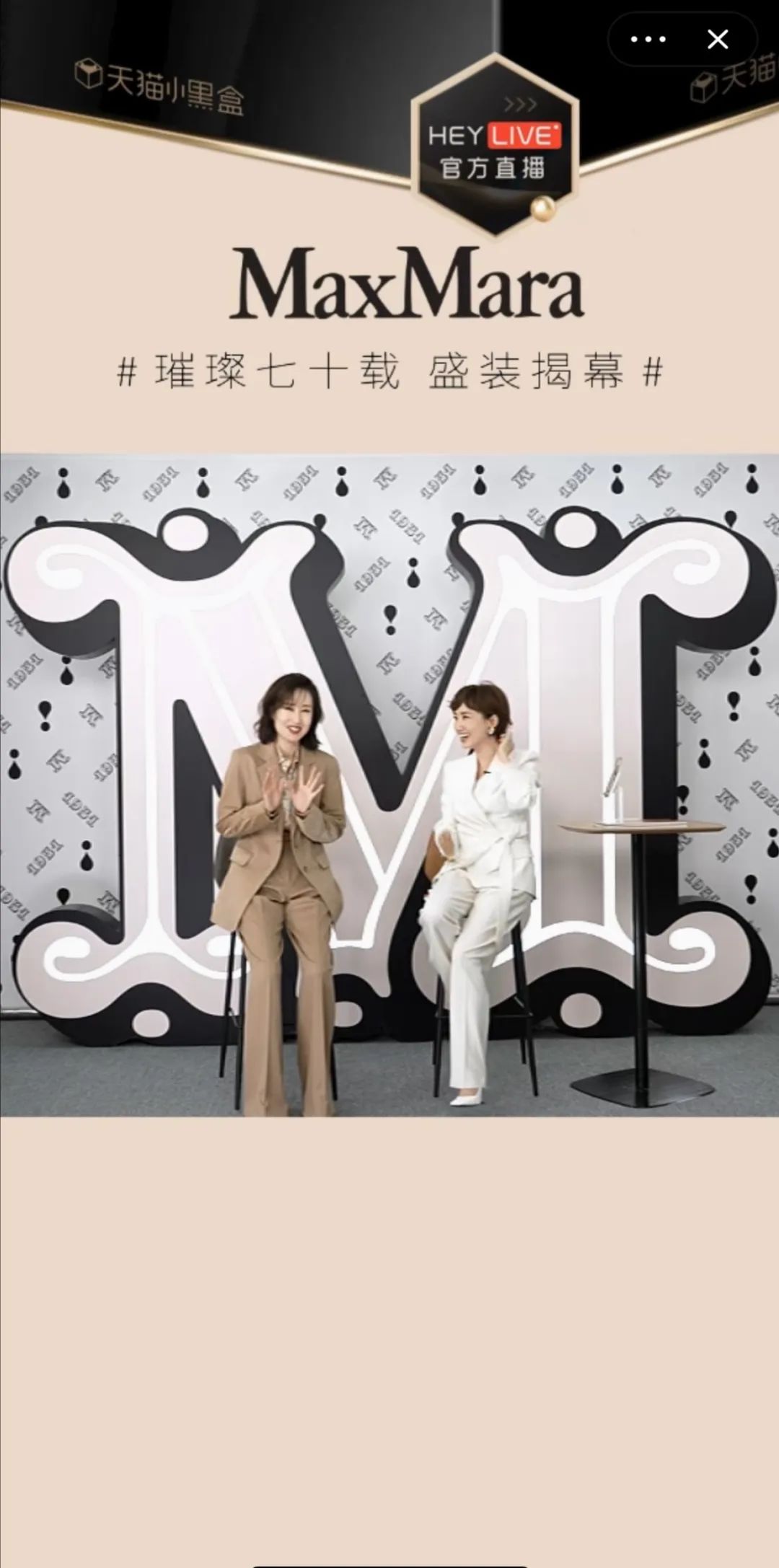 到了2021年,依旧有一些奢侈品牌开启直播首秀,比如意大利奢侈品牌MaxMara在7月正式入驻天猫,同时直播了一场品牌时装秀,9月则借助品牌成立70周年的契机,邀请明星刘敏涛做客直播间,用户可以通过直播间的购物车直接下单。