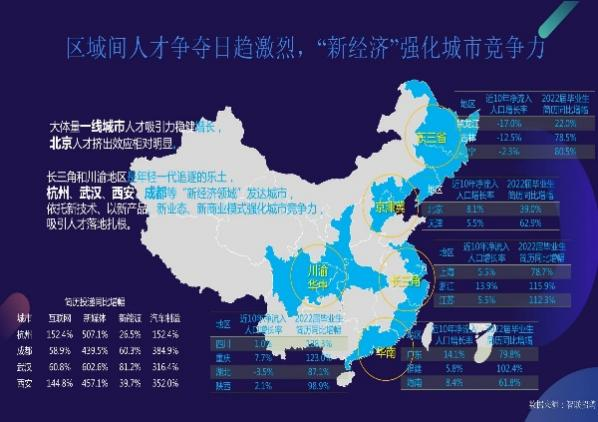 据智联招聘数据显示,长三角和川渝地区是年轻一代追逐的乐土,杭州、武汉、西安、成都等“新经济领域”发达城市,依托新技术、以新产品、新业态、新商业模式强化城市竞争力,吸引人才落地扎根。另据麦可斯研究发现:近五年在“新一线”城市就业的本科毕业生中,外省籍占比从2017届的36%上升至2021届的40%。