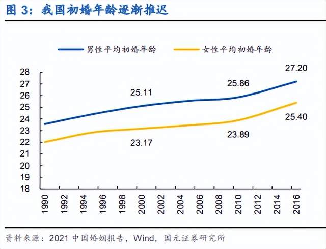据调查数据显示,中国男/女性平均初婚年龄分别从2000年的 25/23岁推迟至2016年的27/25岁,第七次全国人口普查显示在有些大城市、在几乎所有的特大城市和超大城市,初婚年龄已推迟到男性平均30岁以上、女性平均28—29岁以上。