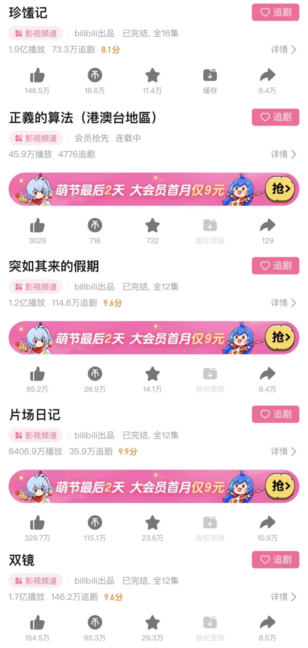 截止发稿前,《珍馐记》《双镜》《突如其来的假期》在B站站内的播放量分别为1.9亿、1.7亿、1.2亿,《片场日记》6000万出头,《正义的算法》仅过45万。