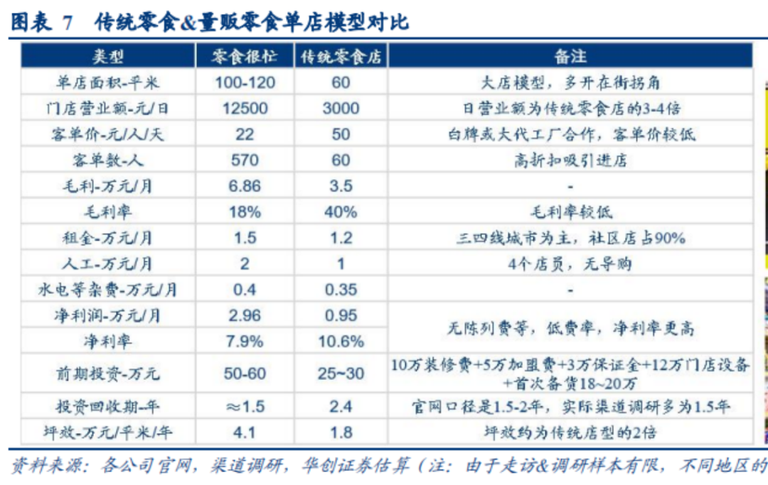 虽然客单价是传统零食店的1/2,但客流量是9-10倍。高客流量以量增收的结果是,即便单店坪效受传统店的2倍,前期投资大,但收款时间只需要1.5-2年时间。