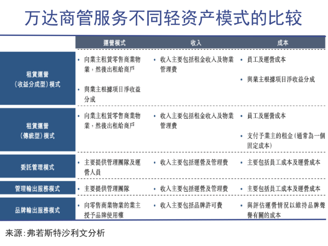 目前,万达轻资产商管服务分为委托管理模式和租赁运营模式。前者是业主委托万达进行招商、运营,并支付一定的服务费;后者则是万达商管租赁业主的资产再拿来出租。类似于“一房东”和“二房东”,但本质上,都是物业运营,只不过采取了不同的模式。