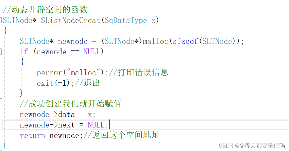 在这里的无论是插入还是删除,我们都可以去画图理解,这样也能防止写错。我们每次的插入都需要malloc动态开辟一个空间,所以不妨直接封装成一个函数**SListNodeCreat**,便于后面的使用,并且我们在开辟空间时,如果能开辟成功了,就把newnode给赋值上:**newnode->data = x newnode->next = NULL**,下面看动态开辟空间的函数实现。