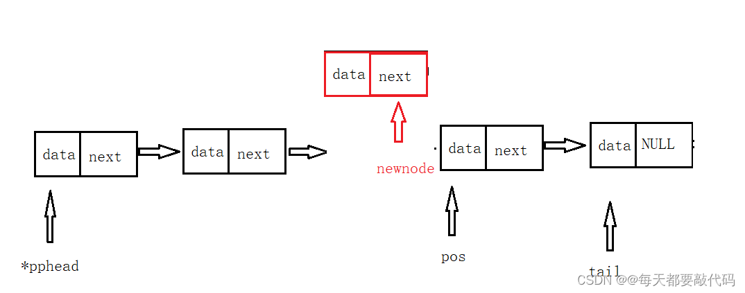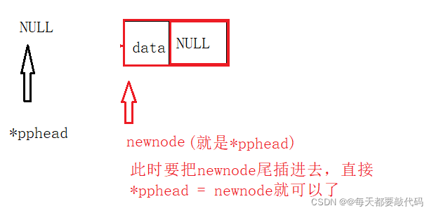 情况2:像我们现在刚开始使用的的一样,才开始就是一个空链表,我们第一次就进行了尾插,此时的pphead和tail肯定都为空指针,这时我们只需要把才开辟的空间newnode赋值给pphead**就可以了,具体逻辑图:
