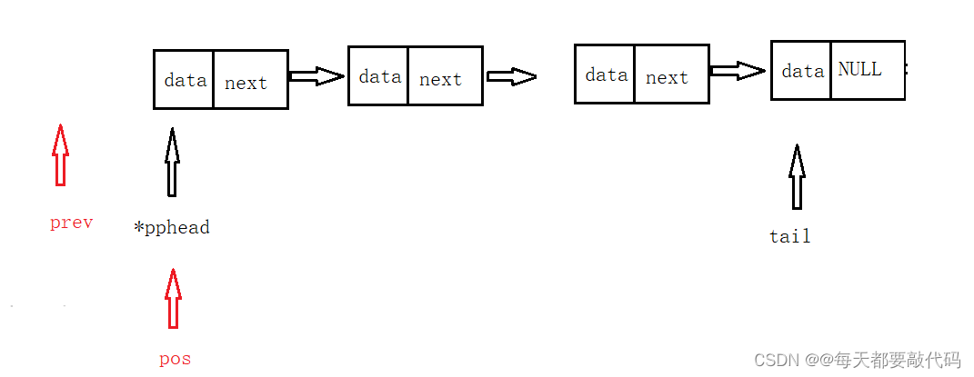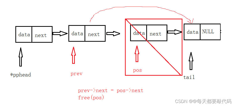 情况1:我们既然要删除pos位置,就要知道pos的前一个位置prev,这样才能使prev->next = pos->next;中间跳过pos,具体逻辑图如下: