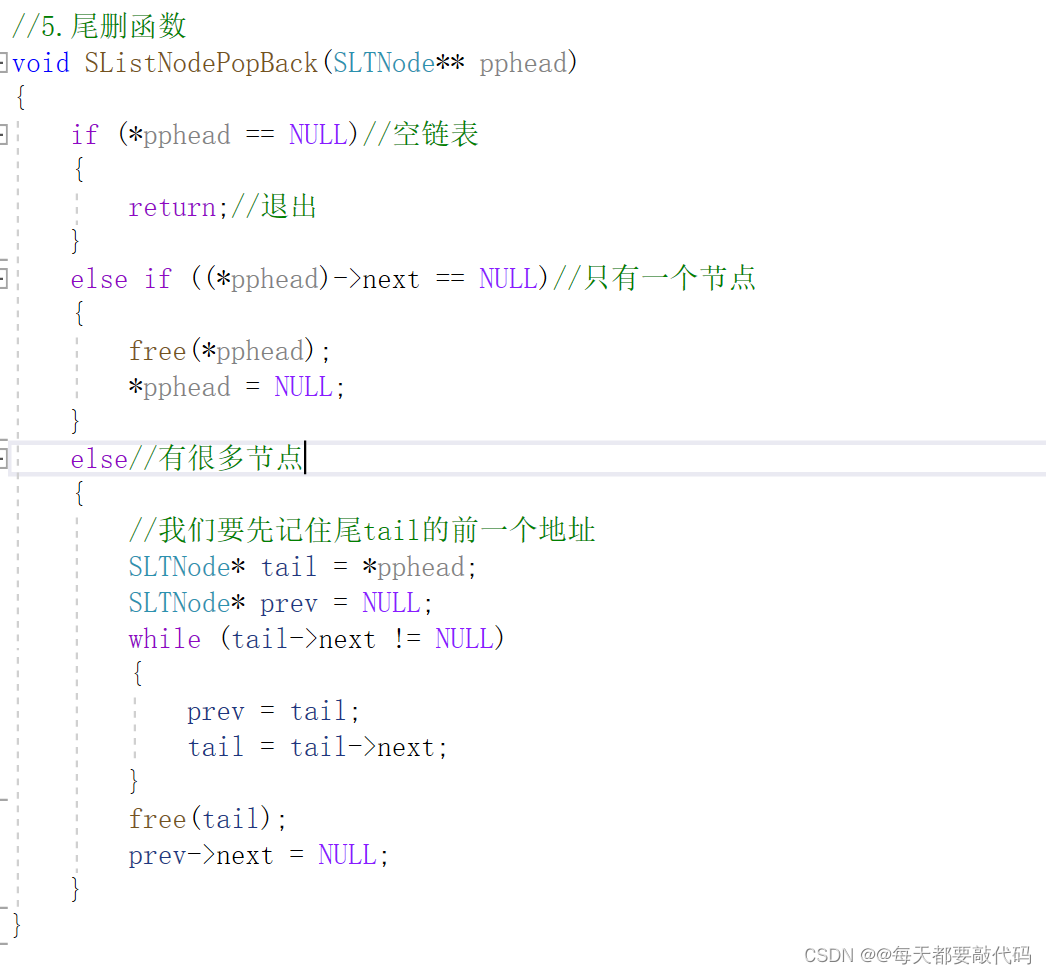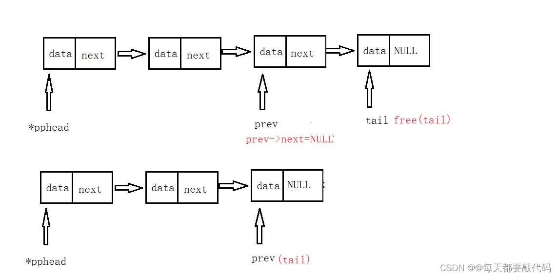 情况1:链表里本身有很多元素,我们进行尾删时怎么办呢?肯定需要找到尾指针tail,因为我们malloc动态创建的,最后不使用了肯定要free释放掉;那还需要知道什么呢?我们还需要把最后一个指针的next置为空啊!我们都已经释放掉尾指针tail怎么找它前面一个指针prev把它的next置位空呢?所以我们还需要一个指针prev记住tail的前一个指针,下面看逻辑图: