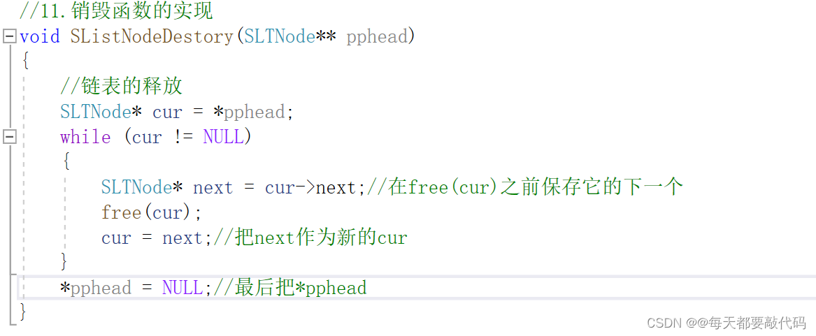 链表的销毁和顺序表不同,顺序表是连续的空间,free一次就可以;而链表创建的空间是不连续的,我们malloc多少次,就需要free多少次,下面看具体代码: