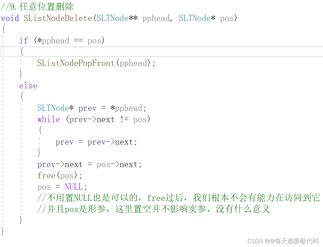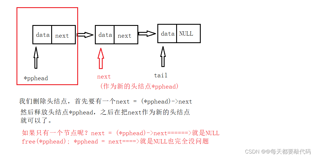 情况2:问题又来了,如果还是在*pos = *pphead**位置删除呢?这样pos又没有前一个地址prev,怎么办呢?最简单的方法还是调用以前的函数,这里调用头删函数*SListNodePopFront**,具体逻辑图如下: