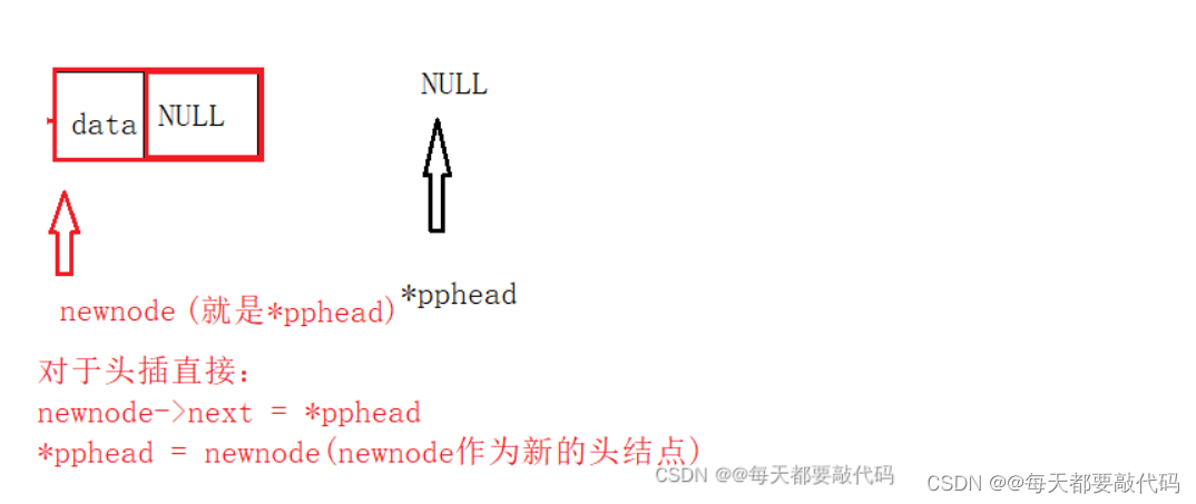 对于头插函数就很简单了,它不像顺序表那样还需要移动后面的元素,所以无论是空链表还是有元素的链表都是一样的;这里通过指针直接链接,下面看具体逻辑图: