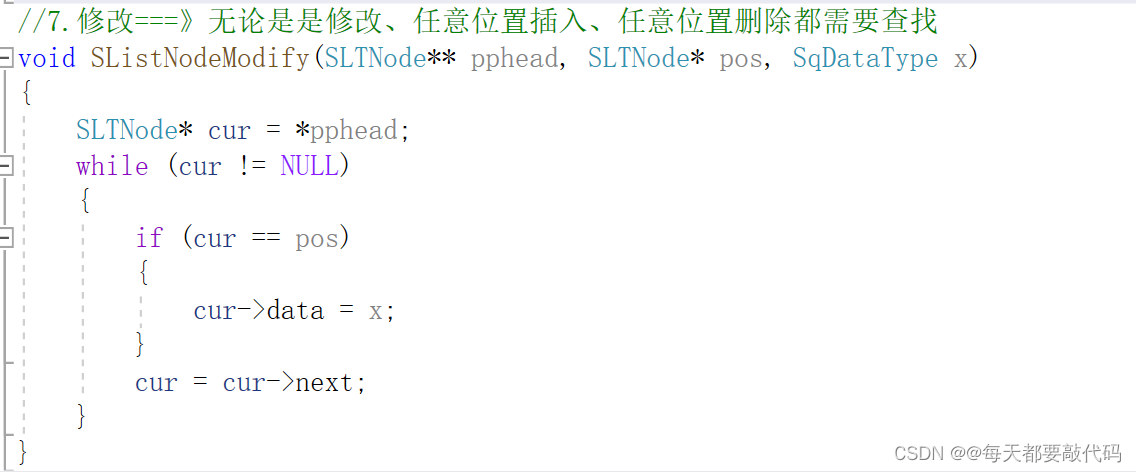 这里我们要明确一点,无论是修改、任意位置插入、任意位置删除,都是需要查找函数**SListNodeFind**,因为它不像顺序表那样可以直接给出下标去插入、删除。这里必须根据数据去搜索,返回地址,根据地址进行任意插入和删除。既然这样,我们不如封装一个查找函数,并且对于查找函数我们也可以用传值调用,因为它并不需要改变数据;但是这里为了保持统一,我用的都是传址调用。