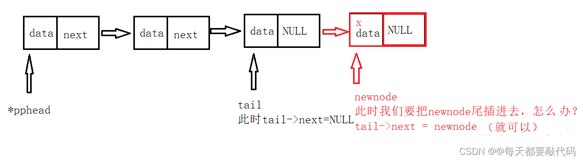 情况1:链表里本身就有很多数据,我们这时只需要找到尾结点(暂定为tail),把tail->next=NULL改成tail->next = newnode就可以,至于newnode->next=NULL就不需要写了,因为我们开辟空间时就已经让newnode->data=x和newnode->next=NULL了,下面看具体逻辑图: