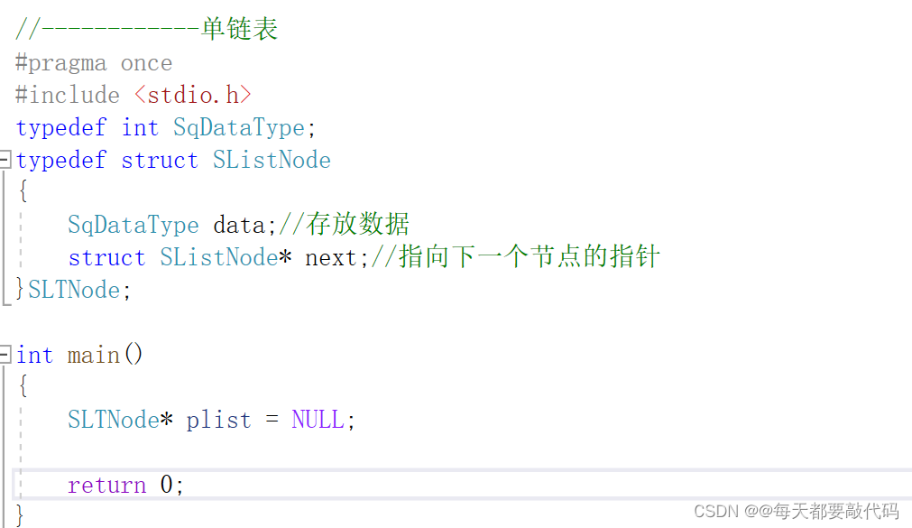单链表创建的结构和顺序表是很相似的,这里我们只需要两个参数,一个data用来存储数据;一个next指针,用来指向下一个地址;并且我们用的是**无头单向非循环链表**,所以我们才开始的头指针plist初始化为NULL!那如果是带头结点的单链表呢?此时的plist就需要初始化成为一个malloc开辟的地址,这个等我们下一期讲到带头双向循环链表就会用到,这里就不在赘述。