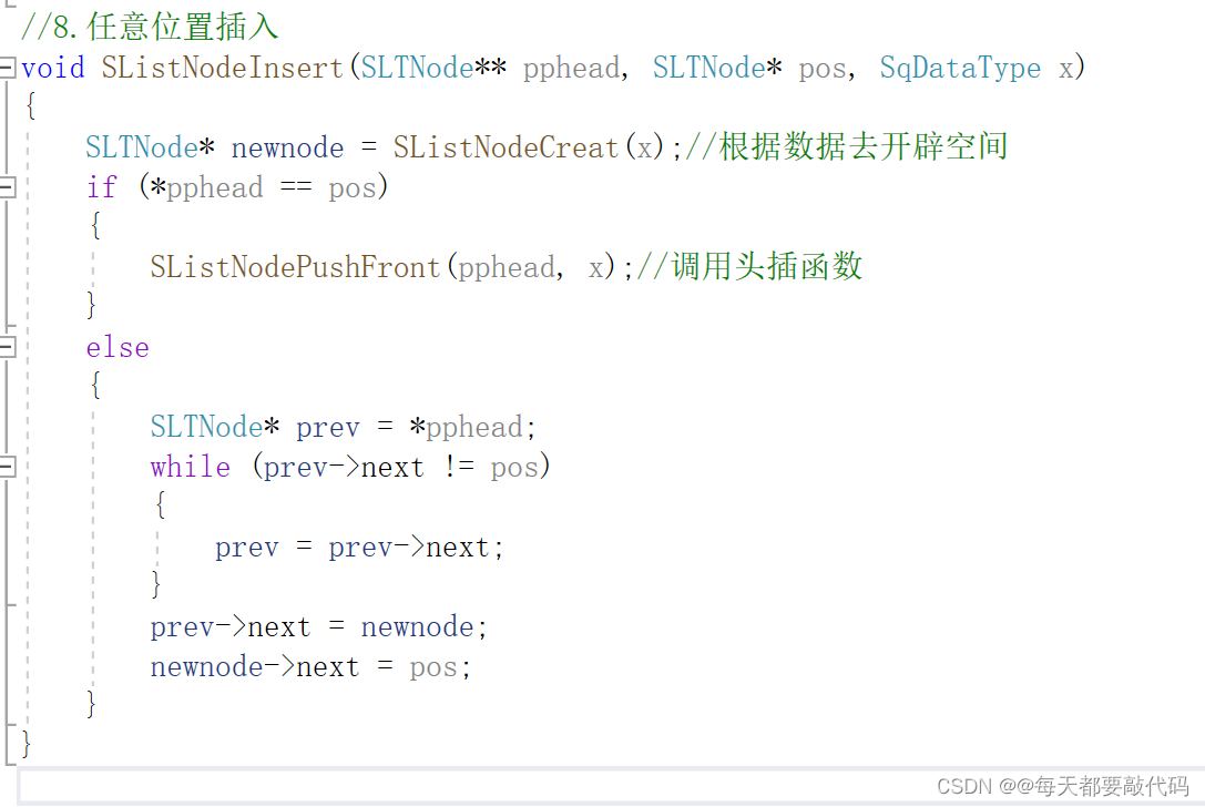 对于任意位置插入,我们也还是要先调用查找函数**SListNodeFind**;然后调用**SListNodeCreat**进行动态开辟空间。我们根据查找函数**SListNodeFind**返回的pos地址,在pos地址进行插入操作,具体如下: