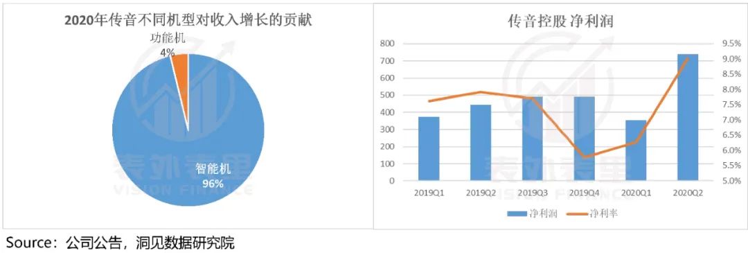 供给匹配需求下,2020年,智能机销售额拉动传音的收入猛增;而2019Q4-2020Q2,传音的利润增速也大幅提升。