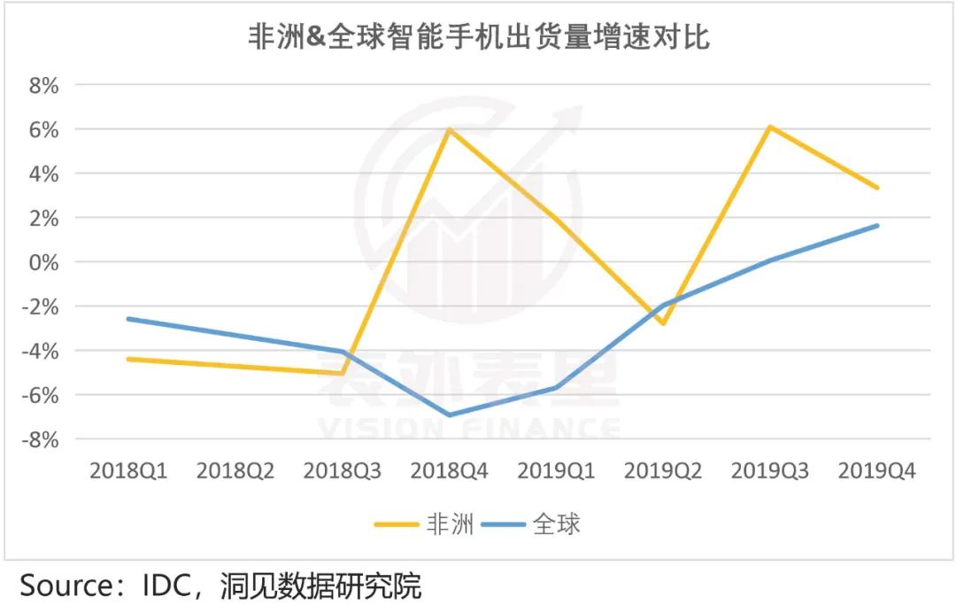 从IDC数据可知,2018Q1-2019Q3,全球智能机出货量持续负增长;与之相反,同期非洲地区的智能手机出货量,在2018Q4后实现持续正增长。