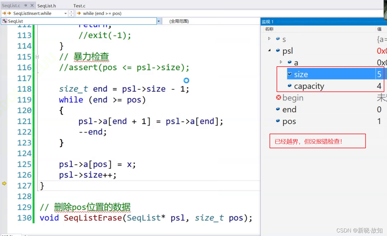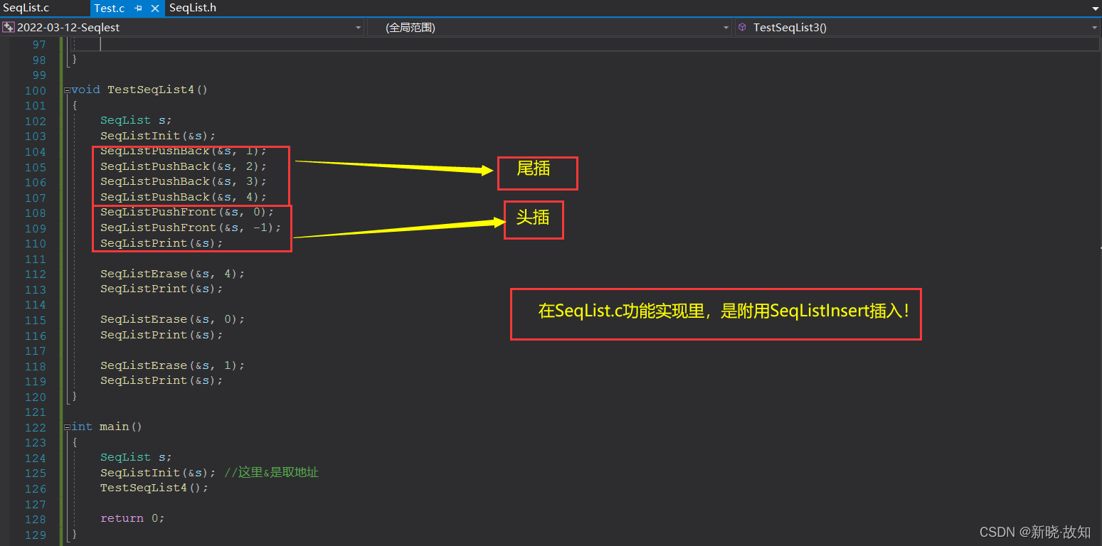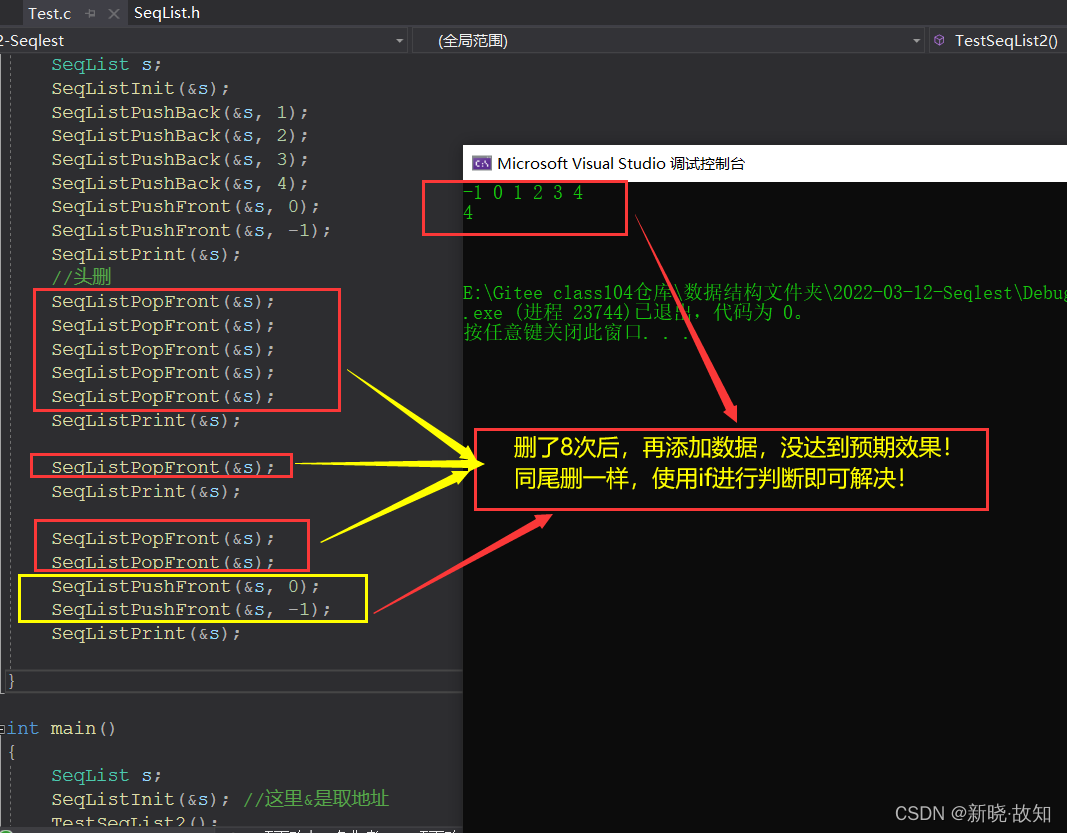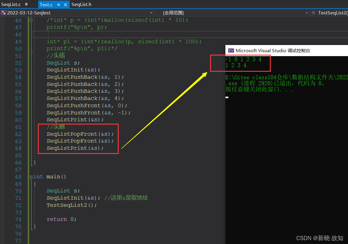 //Test.c 测试 #include "SeqList.h" //void TestSeqList1() //{ //尾插 // SeqList s; // SeqListInit(&s); //这里&是取地址 // SeqListPushBack(&s, 1); // SeqListPushBack(&s, 2); // SeqListPushBack(&s, 3); // SeqListPushBack(&s, 4); // SeqListPushBack(&s, 5); // SeqListPushBack(&s, 0); // SeqListPrint(&s); // //尾删,删除最后两个数据 // SeqListPopBack(&s); // SeqListPopBack(&s); // SeqListPrint(&s); // // SeqListPopBack(&s); // SeqListPopBack(&s); // SeqListPopBack(&s); // SeqListPopBack(&s); // SeqListPopBack(&s); // SeqListPopBack(&s); // SeqListPopBack(&s); // SeqListPopBack(&s); // SeqListPrint(&s); // // SeqListPushBack(&s, 10); // SeqListPushBack(&s, 20); // SeqListPrint(&s); // // //如果不小心传了空指针,须使用断言进行报错查找 // //SeqListPrint(NULL); // // //测试越界 // //int a[10]; // a[10] = 1; // a[11] = 1; // //a[12] = 1; // a[100] = 1; // //} void TestSeqList2() { //扩容测试 /*int* p = (int*)malloc(sizeof(int) * 10); printf("%p\n", p); int* p1 = (int*)realloc(p, sizeof(int) * 100); printf("%p\n", p1);*/ //头插 SeqList s; SeqListInit(&s); SeqListPushBack(&s, 1); SeqListPushBack(&s, 2); SeqListPushBack(&s, 3); SeqListPushBack(&s, 4); SeqListPushFront(&s, 0); SeqListPushFront(&s, -1); SeqListPrint(&s); } int main() { SeqList s; SeqListInit(&s); //这里&是取地址 TestSeqList2(); return 0; } //SeqList.c 功能实现 #include "SeqList.h" //打印顺序表 void SeqListPrint(SeqList* psl) { //Print可以不传指针,因为它不需要修改结构体的内容,但结构体较大,传指针可以减少拷贝 assert(psl); for (int i = 0; i < psl->size; ++i) { printf("%d ", psl->a[i]); } printf("\n"); } //顺序表初始化 void SeqListInit(SeqList* psl) { assert(psl); psl->a = NULL; psl->size = 0; psl->capacity = 0; } //检查容量,降低冗余度 void SeqListCheckCapacity(SeqList* psl) { // ˣҪ if (psl->size == psl->capacity) { //relloc扩容 size_t newCapacity = psl->capacity == 0 ? 4 : psl->capacity * 2; //因为最初是0,*2也是0.所以最初为0就给4个(4没有特定含义,只要不是太大就行),若不是0就 psl->capacity * 2(折中)*3或*4均可 SLDataType* tmp = realloc(psl->a, sizeof(SLDataType) * newCapacity); if (tmp == NULL) { printf("realloc fail\n"); exit(-1); } else { psl->a = tmp; psl->capacity = newCapacity; } } } //顺序表尾插 void SeqListPushBack(SeqList* psl, SLDataType x) { assert(psl); SeqListCheckCapacity(psl); psl->a[psl->size] = x; psl->size++; } //顺序表尾删 void SeqListPopBack(SeqList* psl) { assert(psl); //psl->a[psl->size - 1] = 0; //此语句是将删除后的覆盖为0,但这样做不太好 //原因:1.若原有最后一个为0,意义不大 2.若类型不为int,而是double或char,覆盖为0有误 //因为size标识有效数据,因此即使删除,数据还在capacity,即使删除后没有被覆盖,但不会访问 if (psl->size > 0) { psl->size--; } } //顺序表头插 void SeqListPushFront(SeqList* psl, SLDataType x) { assert(psl); SeqListCheckCapacity(psl); // 挪动数据,腾出头部空间 int end = psl->size - 1; while (end >= 0) { psl->a[end + 1] = psl->a[end]; --end; } psl->a[0] = x; psl->size++; //SeqListInsert(psl, 0, x); } //SeqList.h 头文件 #pragma once #include <stdio.h> #include <stdlib.h> #include <assert.h> // 要求:存储的数据从0开始,依次连续存储 // 静态的顺序表 // 问题:开小了,不够用。开大了,存在浪费。 //#define N 10000 //struct SeqList //{ // int a[N]; // int size; // 记录存储了多少个数据 //}; typedef int SLDataType; // 动态的顺序表 typedef struct SeqList { SLDataType* a; int size; // 存储数据个数 int capacity; // 存储空间大小 }SL, SeqList; //void SLInit(SeqList* psl); //顺序表初始化 void SeqListInit(SeqList* psl); //顺序表销毁 void SeqListDestroy(SeqList* psl); //打印顺序表 void SeqListPrint(SeqList* psl); //检查容量,降低冗余度 void SeqListCheckCapacity(SeqList* psl); //尾插 void SeqListPushBack(SeqList* psl, SLDataType x); //尾删 void SeqListPopBack(SeqList* psl); //头插 void SeqListPushFront(SeqList* psl, SLDataType x); //头删 void SeqListPopFront(SeqList* psl);顺序表头删: