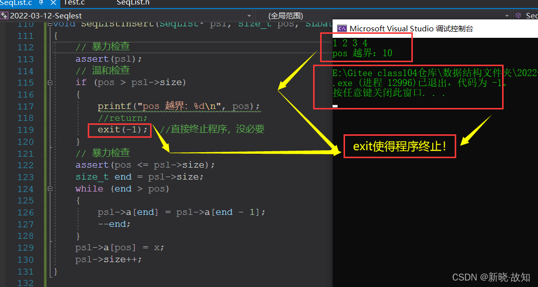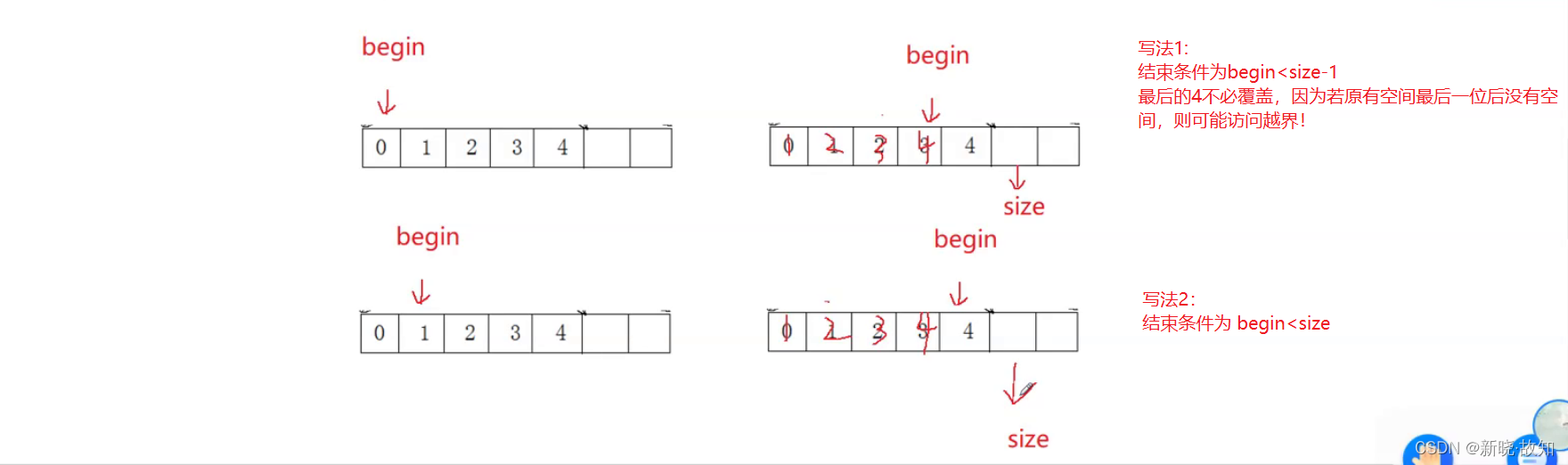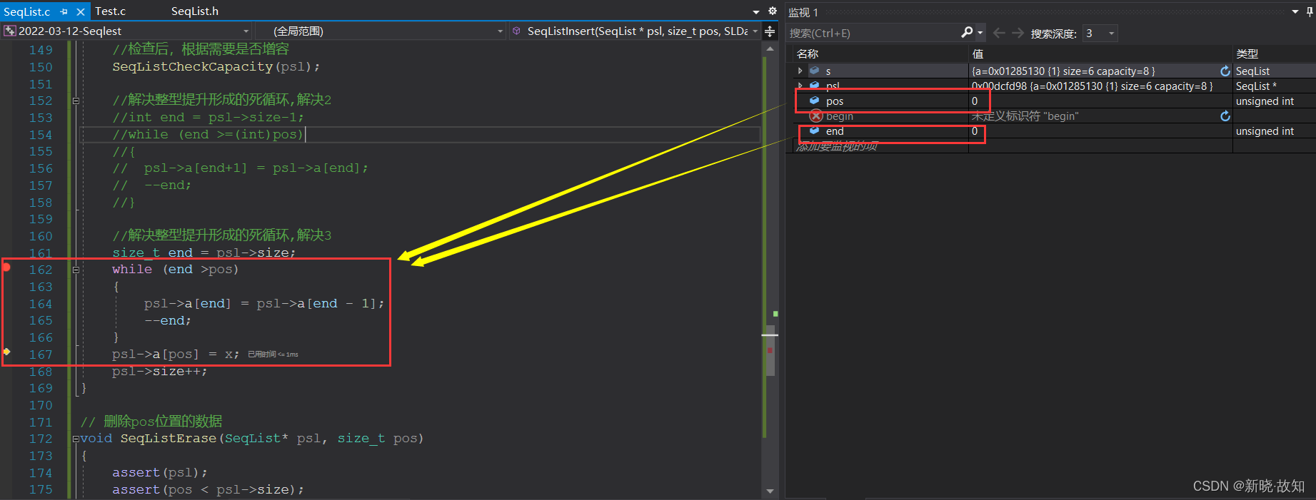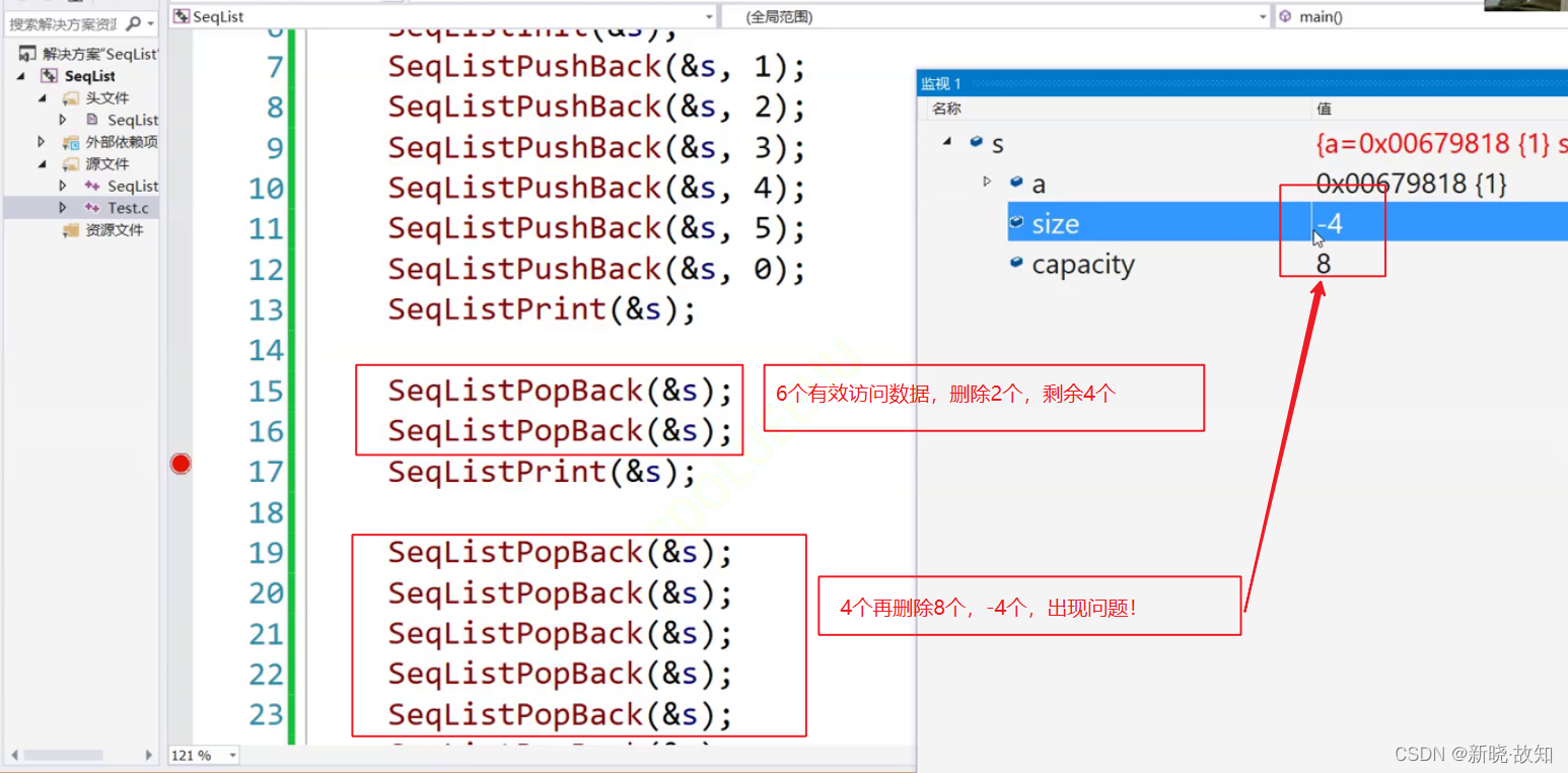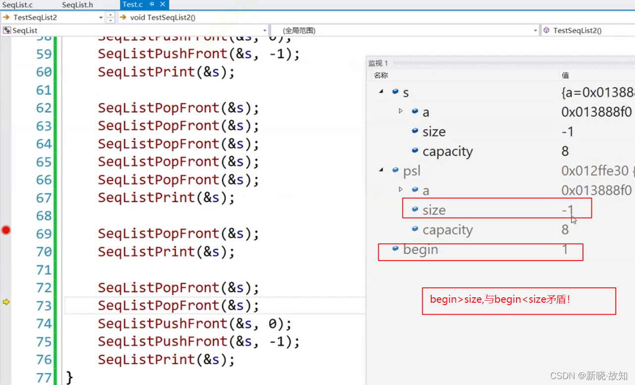 //Test.c 测试 #include "SeqList.h" //void TestSeqList1() //{ //尾插 // SeqList s; // SeqListInit(&s); //这里&是取地址 // SeqListPushBack(&s, 1); // SeqListPushBack(&s, 2); // SeqListPushBack(&s, 3); // SeqListPushBack(&s, 4); // SeqListPushBack(&s, 5); // SeqListPushBack(&s, 0); // SeqListPrint(&s); // //尾删,删除最后两个数据 // SeqListPopBack(&s); // SeqListPopBack(&s); // SeqListPrint(&s); // // SeqListPopBack(&s); // SeqListPopBack(&s); // SeqListPopBack(&s); // SeqListPopBack(&s); // SeqListPopBack(&s); // SeqListPopBack(&s); // SeqListPopBack(&s); // SeqListPopBack(&s); // SeqListPrint(&s); // // SeqListPushBack(&s, 10); // SeqListPushBack(&s, 20); // SeqListPrint(&s); // // //如果不小心传了空指针,须使用断言进行报错查找 // //SeqListPrint(NULL); // // //测试越界 // //int a[10]; // a[10] = 1; // a[11] = 1; // //a[12] = 1; // a[100] = 1; // //} void TestSeqList2() { //扩容测试 /*int* p = (int*)malloc(sizeof(int) * 10); printf("%p\n", p); int* p1 = (int*)realloc(p, sizeof(int) * 100); printf("%p\n", p1);*/ //头插 SeqList s; SeqListInit(&s); SeqListPushBack(&s, 1); SeqListPushBack(&s, 2); SeqListPushBack(&s, 3); SeqListPushBack(&s, 4); SeqListPushFront(&s, 0); SeqListPushFront(&s, -1); SeqListPrint(&s); } int main() { SeqList s; SeqListInit(&s); //这里&是取地址 TestSeqList2(); return 0; } //SeqList.c 功能实现 #include "SeqList.h" //打印顺序表 void SeqListPrint(SeqList* psl) { //Print可以不传指针,因为它不需要修改结构体的内容,但结构体较大,传指针可以减少拷贝 assert(psl); for (int i = 0; i < psl->size; ++i) { printf("%d ", psl->a[i]); } printf("\n"); } //顺序表初始化 void SeqListInit(SeqList* psl) { assert(psl); psl->a = NULL; psl->size = 0; psl->capacity = 0; } //检查容量,降低冗余度 void SeqListCheckCapacity(SeqList* psl) { // ˣҪ if (psl->size == psl->capacity) { //relloc扩容 size_t newCapacity = psl->capacity == 0 ? 4 : psl->capacity * 2; //因为最初是0,*2也是0.所以最初为0就给4个(4没有特定含义,只要不是太大就行),若不是0就 psl->capacity * 2(折中)*3或*4均可 SLDataType* tmp = realloc(psl->a, sizeof(SLDataType) * newCapacity); if (tmp == NULL) { printf("realloc fail\n"); exit(-1); } else { psl->a = tmp; psl->capacity = newCapacity; } } } //顺序表尾插 void SeqListPushBack(SeqList* psl, SLDataType x) { assert(psl); SeqListCheckCapacity(psl); psl->a[psl->size] = x; psl->size++; } //顺序表尾删 void SeqListPopBack(SeqList* psl) { assert(psl); //psl->a[psl->size - 1] = 0; //此语句是将删除后的覆盖为0,但这样做不太好 //原因:1.若原有最后一个为0,意义不大 2.若类型不为int,而是double或char,覆盖为0有误 //因为size标识有效数据,因此即使删除,数据还在capacity,即使删除后没有被覆盖,但不会访问 if (psl->size > 0) { psl->size--; } } //顺序表头插 void SeqListPushFront(SeqList* psl, SLDataType x) { assert(psl); SeqListCheckCapacity(psl); // 挪动数据,腾出头部空间 int end = psl->size - 1; while (end >= 0) { psl->a[end + 1] = psl->a[end]; --end; } psl->a[0] = x; psl->size++; //SeqListInsert(psl, 0, x); } //SeqList.h 头文件 #pragma once #include <stdio.h> #include <stdlib.h> #include <assert.h> // 要求:存储的数据从0开始,依次连续存储 // 静态的顺序表 // 问题:开小了,不够用。开大了,存在浪费。 //#define N 10000 //struct SeqList //{ // int a[N]; // int size; // 记录存储了多少个数据 //}; typedef int SLDataType; // 动态的顺序表 typedef struct SeqList { SLDataType* a; int size; // 存储数据个数 int capacity; // 存储空间大小 }SL, SeqList; //void SLInit(SeqList* psl); //顺序表初始化 void SeqListInit(SeqList* psl); //顺序表销毁 void SeqListDestroy(SeqList* psl); //打印顺序表 void SeqListPrint(SeqList* psl); //检查容量,降低冗余度 void SeqListCheckCapacity(SeqList* psl); //尾插 void SeqListPushBack(SeqList* psl, SLDataType x); //尾删 void SeqListPopBack(SeqList* psl); //头插 void SeqListPushFront(SeqList* psl, SLDataType x); //头删 void SeqListPopFront(SeqList* psl);顺序表头删: