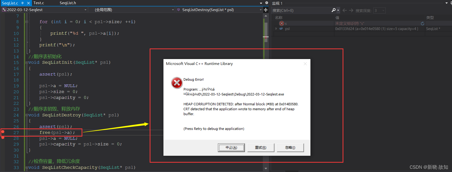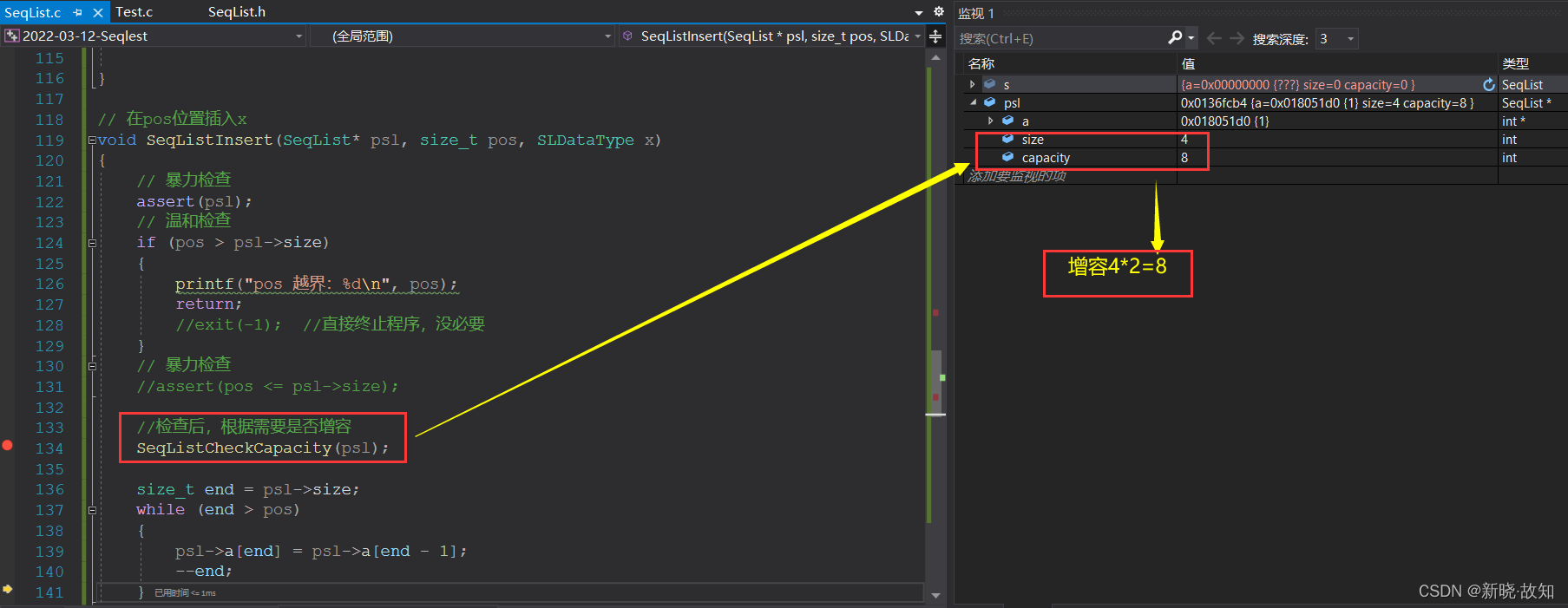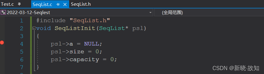 //Test.c 测试 #include "SeqList.h" int main() { SeqList s; SeqListInit(&s); //这里&是取地址 return 0; } //SeqList.c 功能实现 #include "SeqList.h" void SeqListInit(SeqList* psl) { psl->a = NULL; psl->size = 0; psl->capacity = 0; } //SeqList.h 头文件 #pragma once #include <stdio.h> #include <stdlib.h> #include <assert.h> // 要求:存储的数据从0开始,依次连续存储 // 静态的顺序表 // 问题:开小了,不够用。开大了,存在浪费。 //#define N 10000 //struct SeqList //{ // int a[N]; // int size; // 记录存储了多少个数据 //}; typedef int SLDataType; // 动态的顺序表 typedef struct SeqList { SLDataType* a; int size; // 存储数据个数 int capacity; // 存储空间大小 }SL, SeqList; //void SLInit(SeqList* psl); //顺序表初始化 void SeqListInit(SeqList* psl); //顺序表销毁 void SeqListDestroy(SeqList* psl); void SeqListPrint(SeqList* psl); //尾插 void SeqListPushBack(SeqList* psl, SLDataType x); //尾删 void SeqListPopBack(SeqList* psl); //头插 void SeqListPushFront(SeqList* psl, SLDataType x); //头删 void SeqListPopFront(SeqList* psl);顺序表尾插: