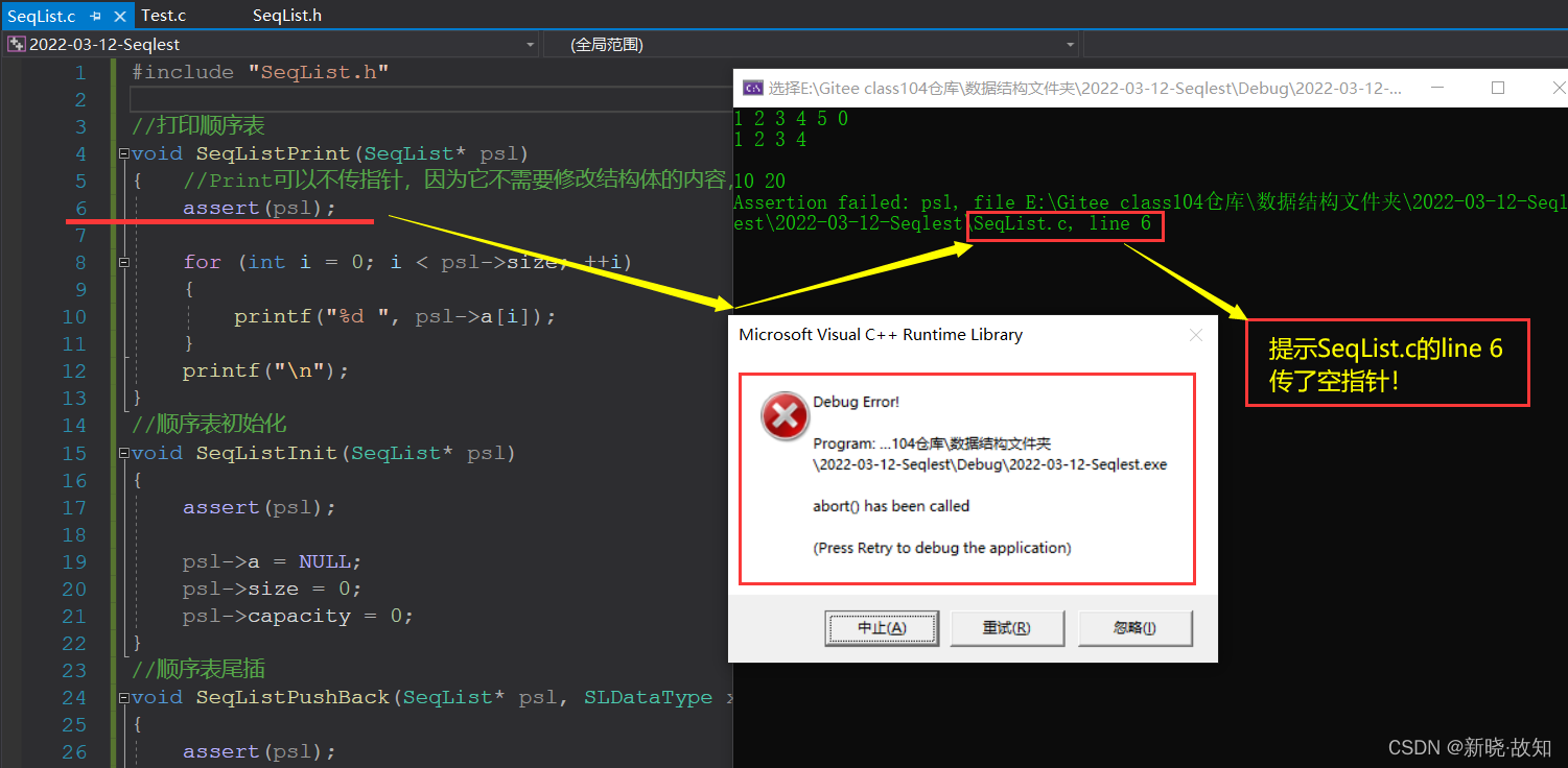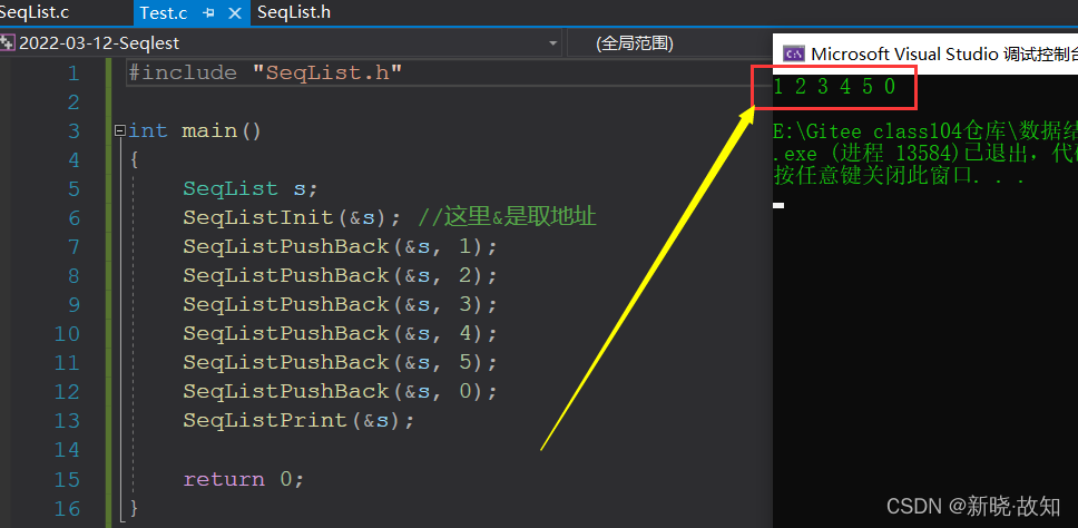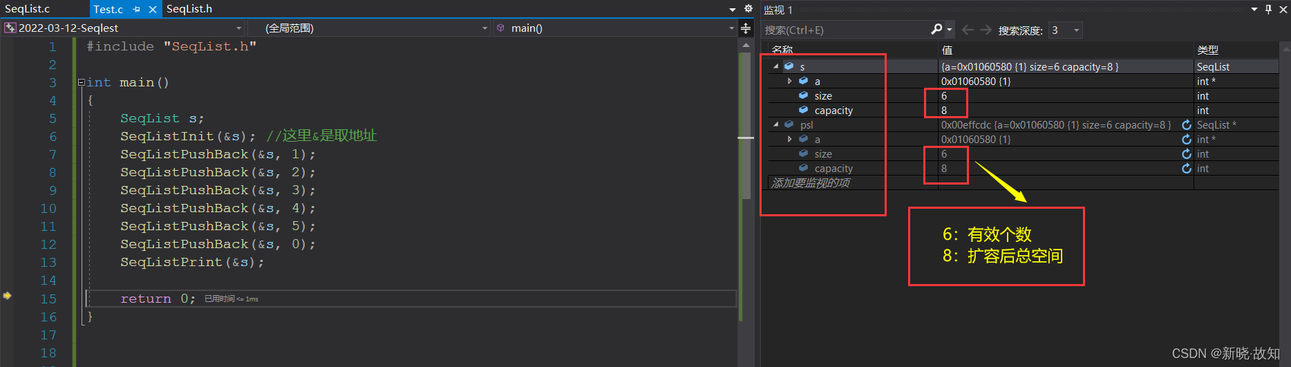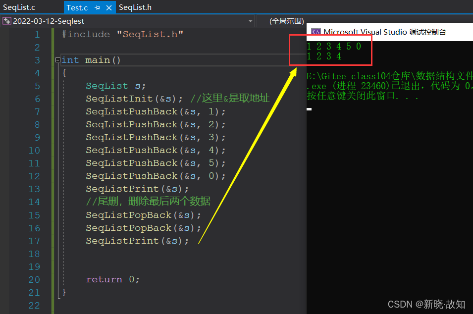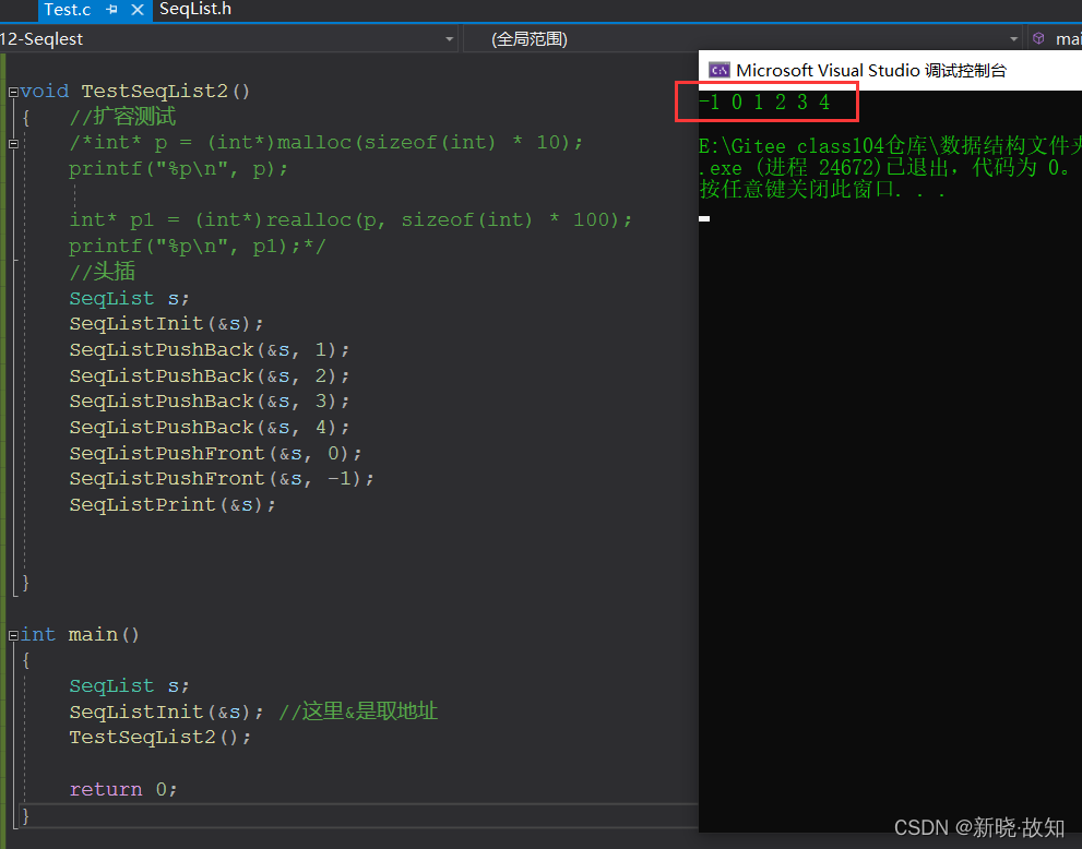 //Test.c 测试 #include "SeqList.h" int main() { SeqList s; SeqListInit(&s); //这里&是取地址 SeqListPushBack(&s, 1); SeqListPushBack(&s, 2); SeqListPushBack(&s, 3); SeqListPushBack(&s, 4); SeqListPushBack(&s, 5); SeqListPushBack(&s, 0); SeqListPrint(&s); return 0; } //SeqList.c 功能实现 #include "SeqList.h" //打印顺序表 void SeqListPrint(SeqList* psl) { //Print可以不传指针,因为它不需要修改结构体的内容,但结构体较大,传指针可以减少拷贝 assert(psl); for (int i = 0; i < psl->size; ++i) { printf("%d ", psl->a[i]); } printf("\n"); } //顺序表初始化 void SeqListInit(SeqList* psl) { assert(psl); psl->a = NULL; psl->size = 0; psl->capacity = 0; } //顺序表尾插 void SeqListPushBack(SeqList* psl, SLDataType x) { assert(psl); // ˣҪ if (psl->size == psl->capacity) { //relloc扩容 size_t newCapacity = psl->capacity == 0 ? 4 : psl->capacity * 2; //因为最初是0,*2也是0.所以最初为0就给4个(4没有特定含义,只要不是太大就行),若不是0就 psl->capacity * 2(折中)*3或*4均可 SLDataType* tmp = realloc(psl->a, sizeof(SLDataType) * newCapacity); if (tmp == NULL) { printf("realloc fail\n"); exit(-1); } else { psl->a = tmp; psl->capacity = newCapacity; } } psl->a[psl->size] = x; psl->size++; } //SeqList.h 头文件 #pragma once #include <stdio.h> #include <stdlib.h> #include <assert.h> // 要求:存储的数据从0开始,依次连续存储 // 静态的顺序表 // 问题:开小了,不够用。开大了,存在浪费。 //#define N 10000 //struct SeqList //{ // int a[N]; // int size; // 记录存储了多少个数据 //}; typedef int SLDataType; // 动态的顺序表 typedef struct SeqList { SLDataType* a; int size; // 存储数据个数 int capacity; // 存储空间大小 }SL, SeqList; //void SLInit(SeqList* psl); //顺序表初始化 void SeqListInit(SeqList* psl); //顺序表销毁 void SeqListDestroy(SeqList* psl); void SeqListPrint(SeqList* psl); //尾插 void SeqListPushBack(SeqList* psl, SLDataType x); //尾删 void SeqListPopBack(SeqList* psl); //头插 void SeqListPushFront(SeqList* psl, SLDataType x); //头删 void SeqListPopFront(SeqList* psl);