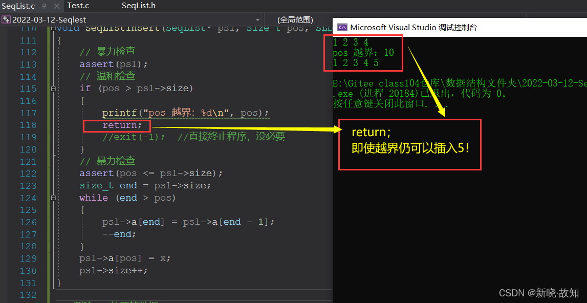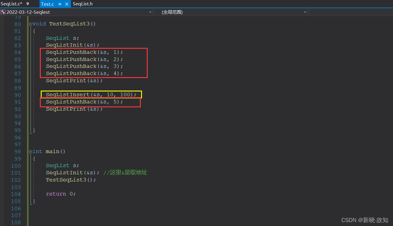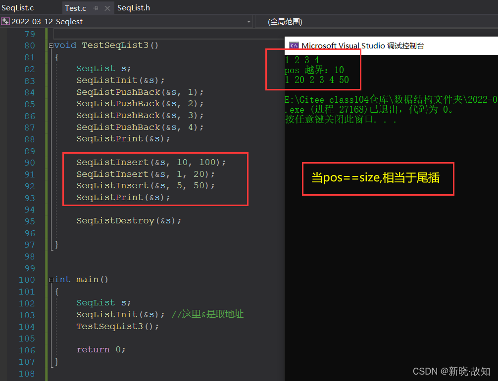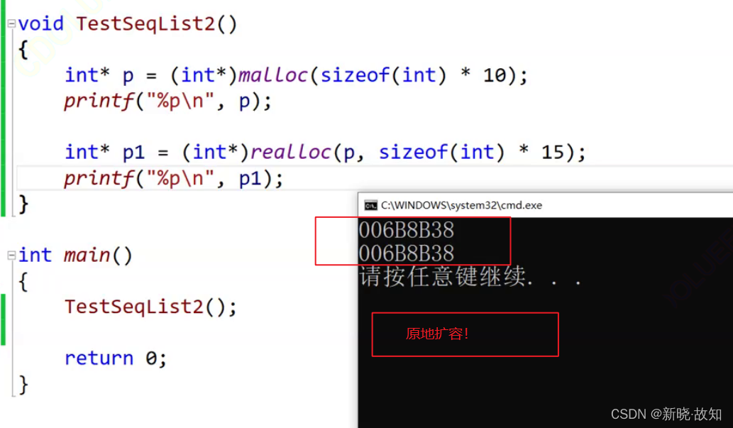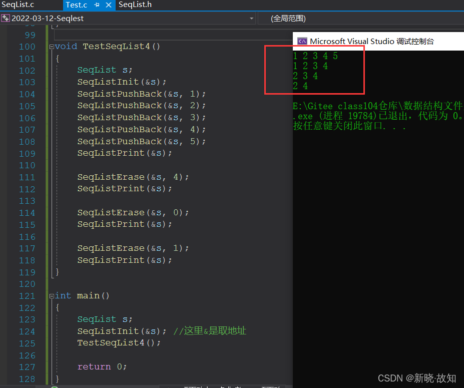 //Test.c 测试 #include "SeqList.h" int main() { SeqList s; SeqListInit(&s); //这里&是取地址 SeqListPushBack(&s, 1); SeqListPushBack(&s, 2); SeqListPushBack(&s, 3); SeqListPushBack(&s, 4); SeqListPushBack(&s, 5); SeqListPushBack(&s, 0); SeqListPrint(&s); return 0; } //SeqList.c 功能实现 #include "SeqList.h" //打印顺序表 void SeqListPrint(SeqList* psl) { //Print可以不传指针,因为它不需要修改结构体的内容,但结构体较大,传指针可以减少拷贝 assert(psl); for (int i = 0; i < psl->size; ++i) { printf("%d ", psl->a[i]); } printf("\n"); } //顺序表初始化 void SeqListInit(SeqList* psl) { assert(psl); psl->a = NULL; psl->size = 0; psl->capacity = 0; } //顺序表尾插 void SeqListPushBack(SeqList* psl, SLDataType x) { assert(psl); // ˣҪ if (psl->size == psl->capacity) { //relloc扩容 size_t newCapacity = psl->capacity == 0 ? 4 : psl->capacity * 2; //因为最初是0,*2也是0.所以最初为0就给4个(4没有特定含义,只要不是太大就行),若不是0就 psl->capacity * 2(折中)*3或*4均可 SLDataType* tmp = realloc(psl->a, sizeof(SLDataType) * newCapacity); if (tmp == NULL) { printf("realloc fail\n"); exit(-1); } else { psl->a = tmp; psl->capacity = newCapacity; } } psl->a[psl->size] = x; psl->size++; } //SeqList.h 头文件 #pragma once #include <stdio.h> #include <stdlib.h> #include <assert.h> // 要求:存储的数据从0开始,依次连续存储 // 静态的顺序表 // 问题:开小了,不够用。开大了,存在浪费。 //#define N 10000 //struct SeqList //{ // int a[N]; // int size; // 记录存储了多少个数据 //}; typedef int SLDataType; // 动态的顺序表 typedef struct SeqList { SLDataType* a; int size; // 存储数据个数 int capacity; // 存储空间大小 }SL, SeqList; //void SLInit(SeqList* psl); //顺序表初始化 void SeqListInit(SeqList* psl); //顺序表销毁 void SeqListDestroy(SeqList* psl); void SeqListPrint(SeqList* psl); //尾插 void SeqListPushBack(SeqList* psl, SLDataType x); //尾删 void SeqListPopBack(SeqList* psl); //头插 void SeqListPushFront(SeqList* psl, SLDataType x); //头删 void SeqListPopFront(SeqList* psl);