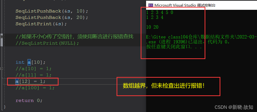 //Test.c 测试 #include "SeqList.h" int main() { SeqList s; SeqListInit(&s); //这里&是取地址 SeqListPushBack(&s, 1); SeqListPushBack(&s, 2); SeqListPushBack(&s, 3); SeqListPushBack(&s, 4); SeqListPushBack(&s, 5); SeqListPushBack(&s, 0); SeqListPrint(&s); //尾删,删除最后两个数据 SeqListPopBack(&s); SeqListPopBack(&s); SeqListPrint(&s); return 0; } //SeqList.c 功能实现 #include "SeqList.h" //打印顺序表 void SeqListPrint(SeqList* psl) { //Print可以不传指针,因为它不需要修改结构体的内容,但结构体较大,传指针可以减少拷贝 assert(psl); for (int i = 0; i < psl->size; ++i) { printf("%d ", psl->a[i]); } printf("\n"); } //顺序表初始化 void SeqListInit(SeqList* psl) { assert(psl); psl->a = NULL; psl->size = 0; psl->capacity = 0; } //顺序表尾插 void SeqListPushBack(SeqList* psl, SLDataType x) { assert(psl); // ˣҪ if (psl->size == psl->capacity) { //relloc扩容 size_t newCapacity = psl->capacity == 0 ? 4 : psl->capacity * 2; //因为最初是0,*2也是0.所以最初为0就给4个(4没有特定含义,只要不是太大就行),若不是0就 psl->capacity * 2(折中)*3或*4均可 SLDataType* tmp = realloc(psl->a, sizeof(SLDataType) * newCapacity); if (tmp == NULL) { printf("realloc fail\n"); exit(-1); } else { psl->a = tmp; psl->capacity = newCapacity; } } psl->a[psl->size] = x; psl->size++; } //顺序表尾删 void SeqListPopBack(SeqList* psl) { assert(psl); //psl->a[psl->size - 1] = 0; //此语句是将删除后的覆盖为0,但这样做不太好 //原因:1.若原有最后一个为0,意义不大 2.若类型不为int,而是double或char,覆盖为0有误 //因为size标识有效数据,因此即使删除,数据还在capacity,即使删除后没有被覆盖,但不会访问 if (psl->size > 0) { psl->size--; } } //SeqList.h 头文件 #pragma once #include <stdio.h> #include <stdlib.h> #include <assert.h> // 要求:存储的数据从0开始,依次连续存储 // 静态的顺序表 // 问题:开小了,不够用。开大了,存在浪费。 //#define N 10000 //struct SeqList //{ // int a[N]; // int size; // 记录存储了多少个数据 //}; typedef int SLDataType; // 动态的顺序表 typedef struct SeqList { SLDataType* a; int size; // 存储数据个数 int capacity; // 存储空间大小 }SL, SeqList; //void SLInit(SeqList* psl); //顺序表初始化 void SeqListInit(SeqList* psl); //顺序表销毁 void SeqListDestroy(SeqList* psl); //打印顺序表 void SeqListPrint(SeqList* psl); //尾插 void SeqListPushBack(SeqList* psl, SLDataType x); //尾删 void SeqListPopBack(SeqList* psl); //头插 void SeqListPushFront(SeqList* psl, SLDataType x); //头删 void SeqListPopFront(SeqList* psl);