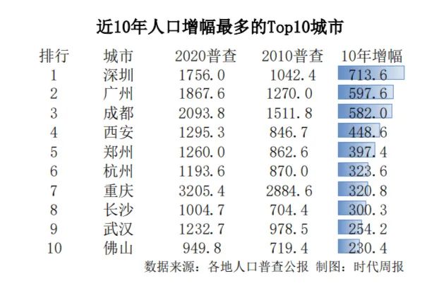 根据第七次全国人口普查数据,从2010到2020年,郑州新增常住人口397.4万。在全国人口增幅最多的10座城市中,郑州位列第五。