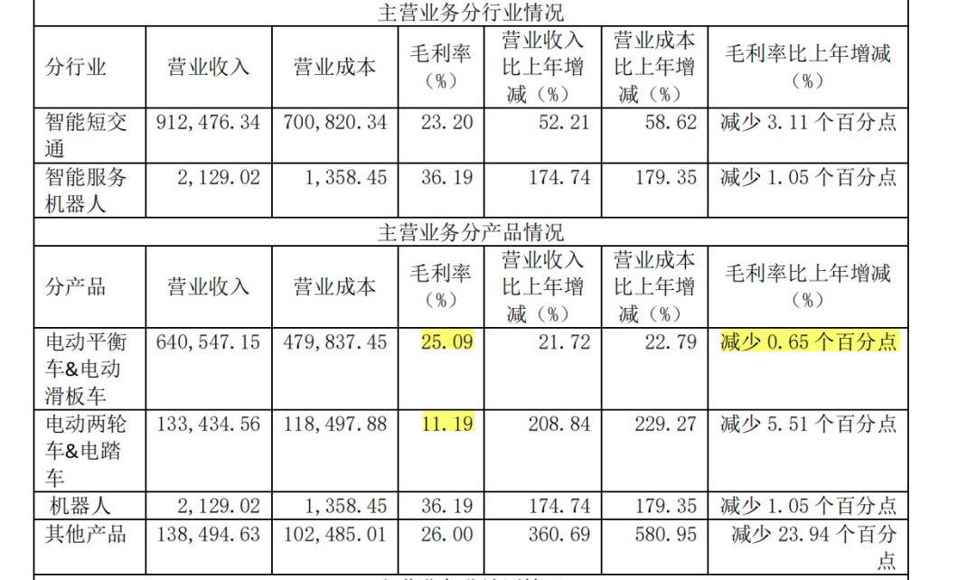 与此同时,分产品看,包括电动平衡车与滑板车、电动两轮车与电踏车、机器人、其他产品(全地形车等)四大业务毛利均呈现下滑趋势。