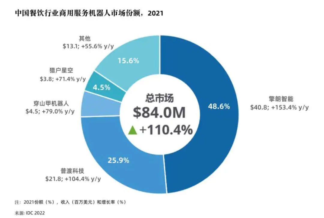 目前在餐饮等垂直领域内,一些明星企业已占据先发优势。以餐饮行业为例,据IDC《中国餐饮行业商用服务机器人市场份额报告2021》显示,擎朗智能以48.6%的市场占有率位居第一位,第二则为普渡科技,市场份额为25.9%。