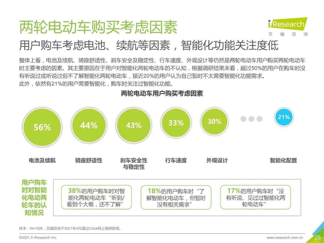 另一方面,从消费端来看,用户对两轮电动车的需求大多仍集中在续航与电池。来自艾瑞咨询的一份调研报告显示, 2021年中国电动两轮车车主购车最主要的关注因素依然是电池及续航、质量和动力性能,对智能化功能的关注因素仅排在第四。