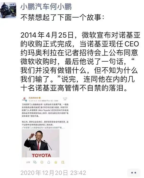 但即使是到了2020年,丰田的掌门人丰田章男还曾炮轰“电动汽车被过度炒作了”,这在当时引全球同行侧目,小鹏汽车的何小鹏在微博上回怼,讥讽丰田未来的命运,或将要成为下一个诺基亚。