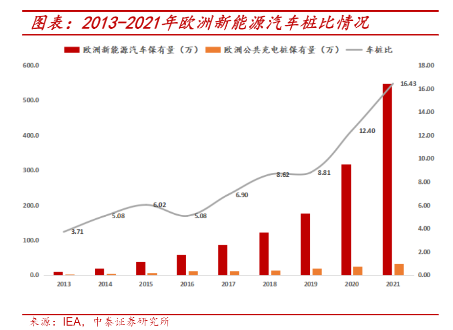 IEA的统计数据显示,2021年欧洲电动汽车保有量从2013年的10.3万辆增到2021年548.3万辆,CAGR(复合年均增长率)为55.6%;但同期欧洲公共充电桩保有量为2.8万台增长到33.4万台,CAGR仅为31.88%。