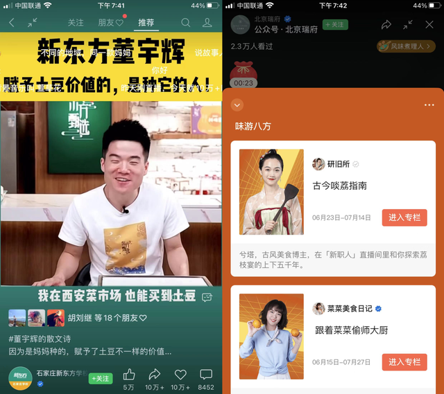 不过,微信最近的两个变化,似乎正在尝试从内容分发上,通过算法推荐与抖音快手对齐。其一是,现在视频号默认进入页已经从之前的朋友点赞,改为推荐列。另一个则是,在点开一个直播间时,点击直播间名称,就能够看到一条上下滑动的信息流,推荐类似账号。