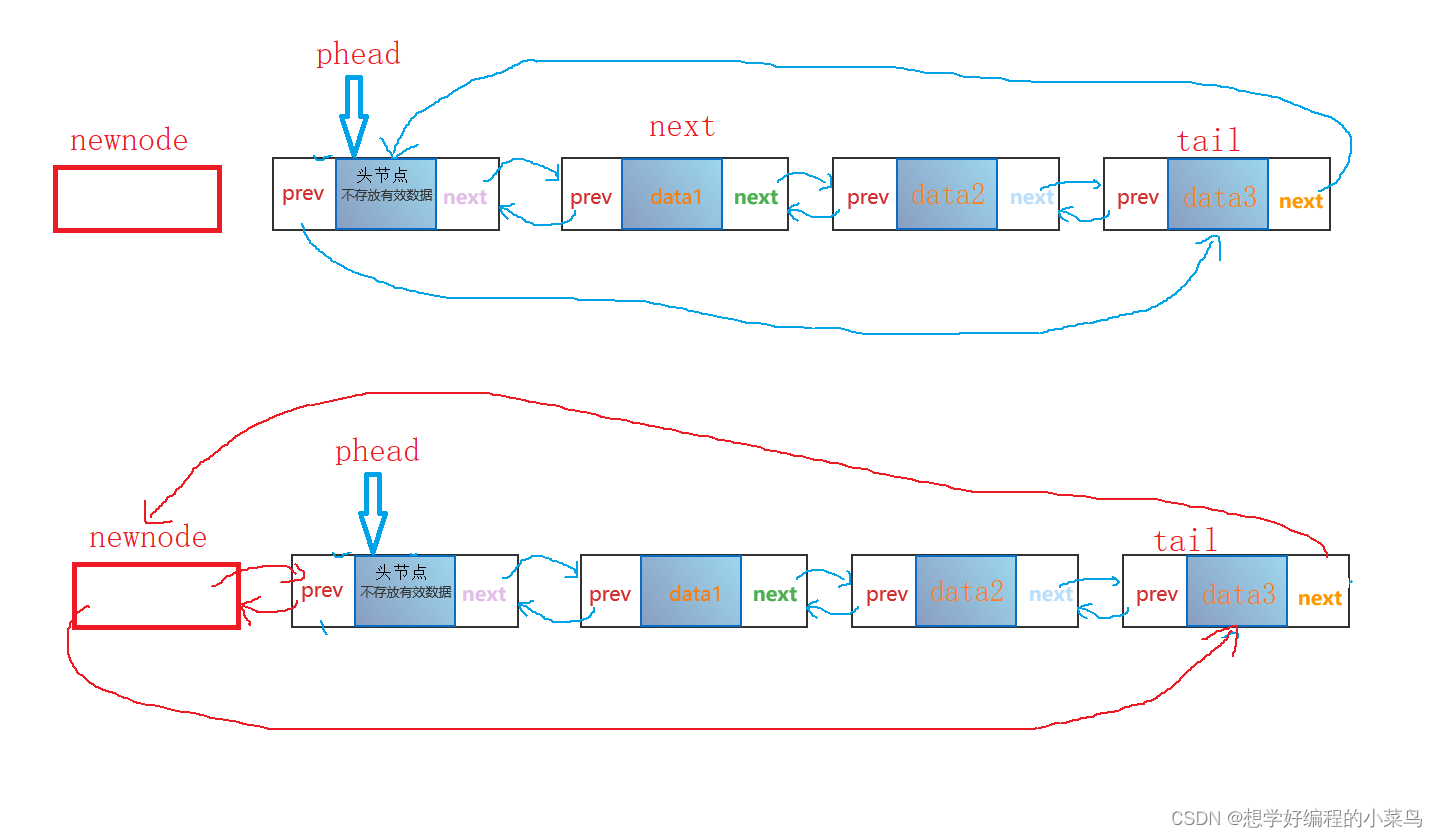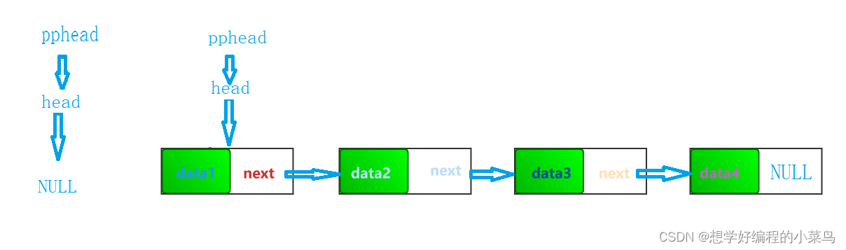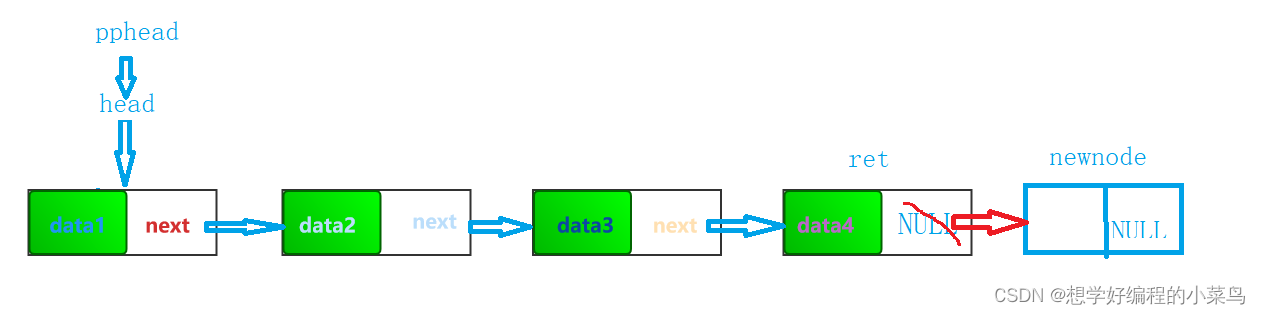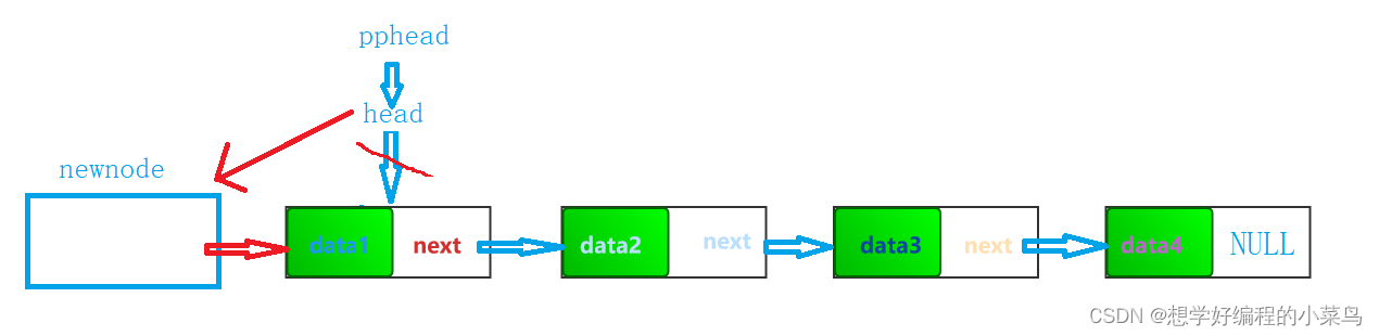 我们要将新节点的next指向那个data1在的节点,然后然头指针head指向newnode,即使头指针为空,那newnode的next也是指向NULL的