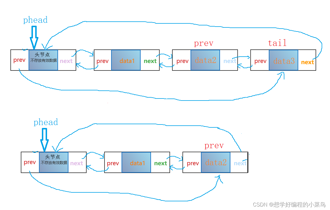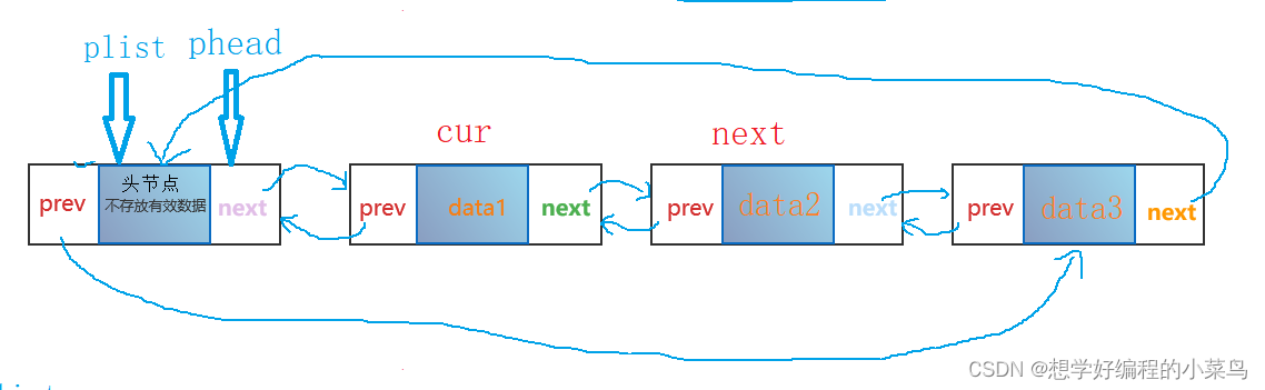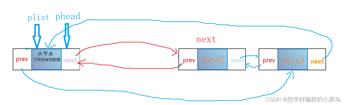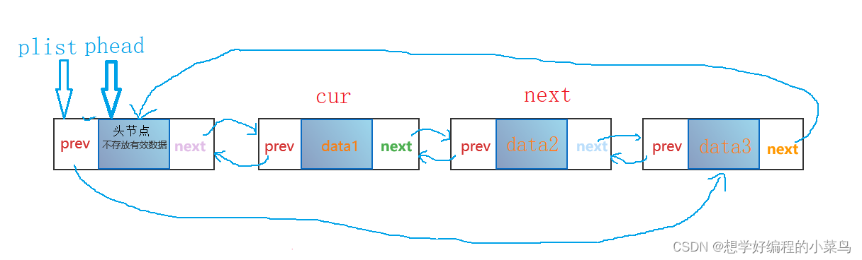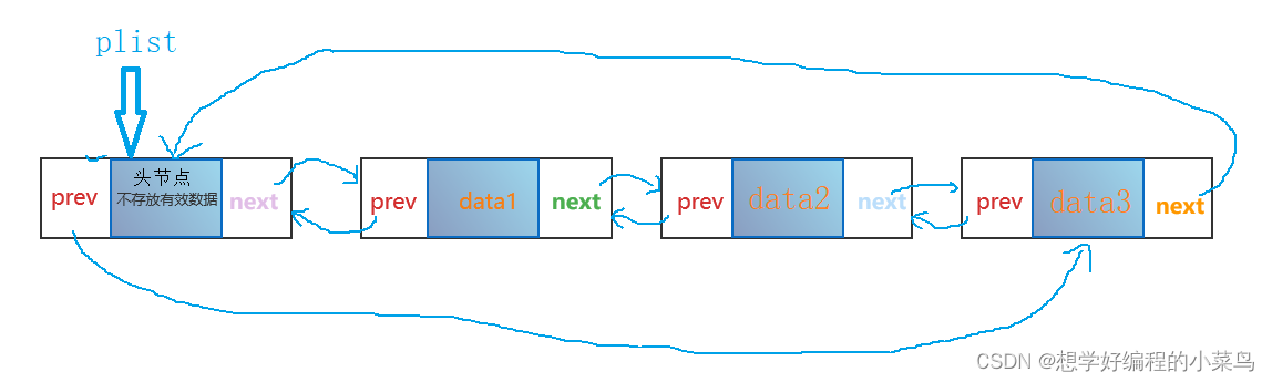 下图就是双向循环链表,尾节点data3的next指向头节点,头节点的prev指向尾节点,就构成循环
