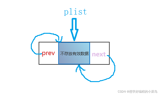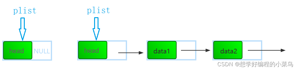 下图:假定有一个plist的指针维护链表,头节点head,有效数据存储在头节点之后,如果没有存储数据,头节点的next就指向NULL,这样不管是头插头删还是尾插尾删都不需要像不带头的链表需要判断头节点是否为空
