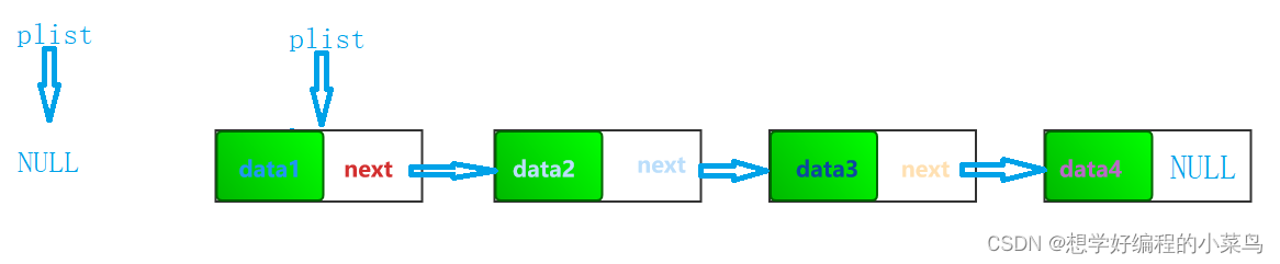 不带头:没有头节点,plsit直接指向有效数据,链表为空时plist就指向NULL;