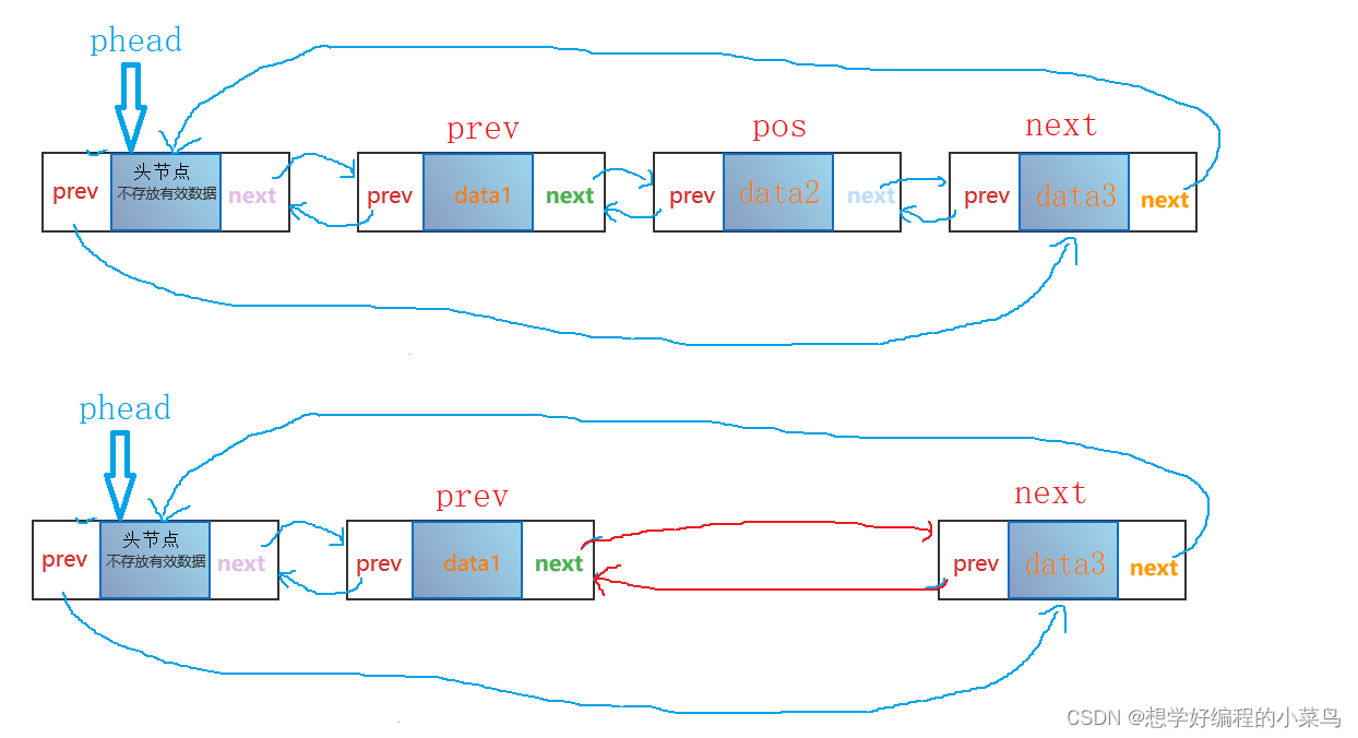 如果pos->next == pos表是此是只有头节点,没有存储其他节点,所以断言一下,不能把头节点删了,定义两个指针记录pos前一个节点和后一个节点,方便删除pos位置节点,同样当我们定义了这个函数就可以代替头删和尾删了