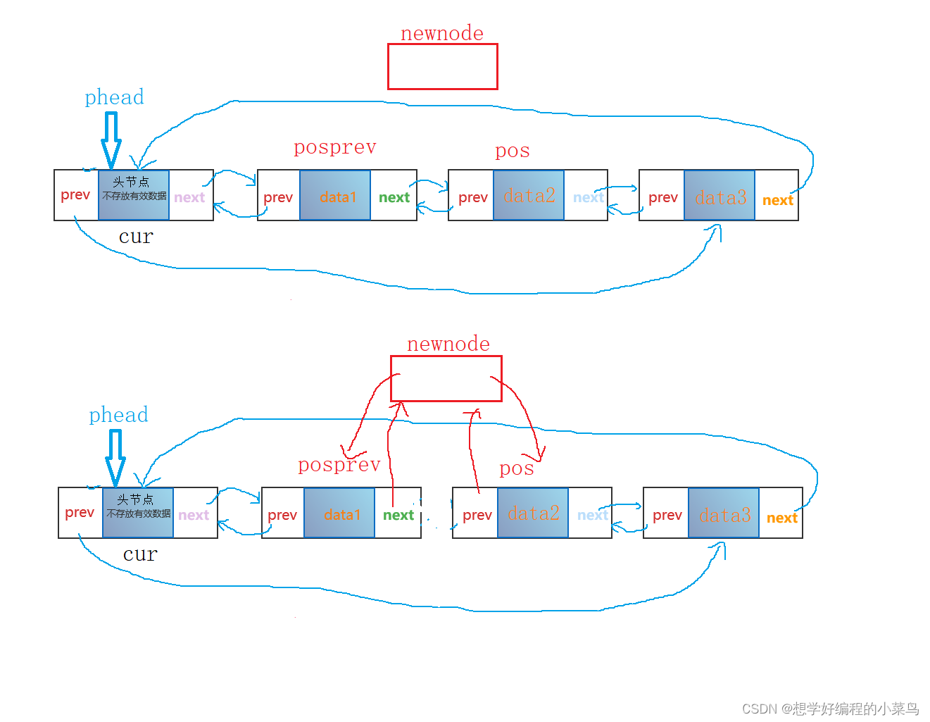 首先断言pos不为空,创建新节点newnode,在定义一个posprev记录pos的前一个节点,然后形成链接关系,这里不在赘述了,当我们定义了这个函数后就可以代替头插尾插了,头插pos的位置为phead->next,尾插pos位置为phead