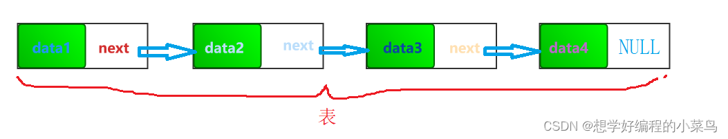 节点的结构为:data数据保存值,next保存下一节点地址,通过next找到下一节点,且尾节点的next始终指向NULL