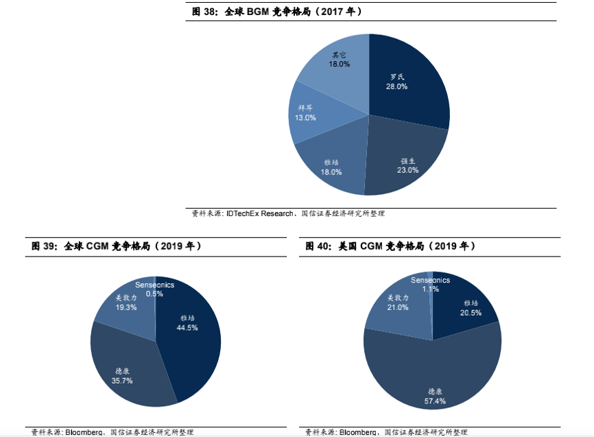 如下图所示,不管是BGM市场还是CGM市场,都是被罗氏等巨头垄断。就拿全球CGM市场来说,雅培占据44.5%市场,德康以35.7%的市场份额紧随其后。