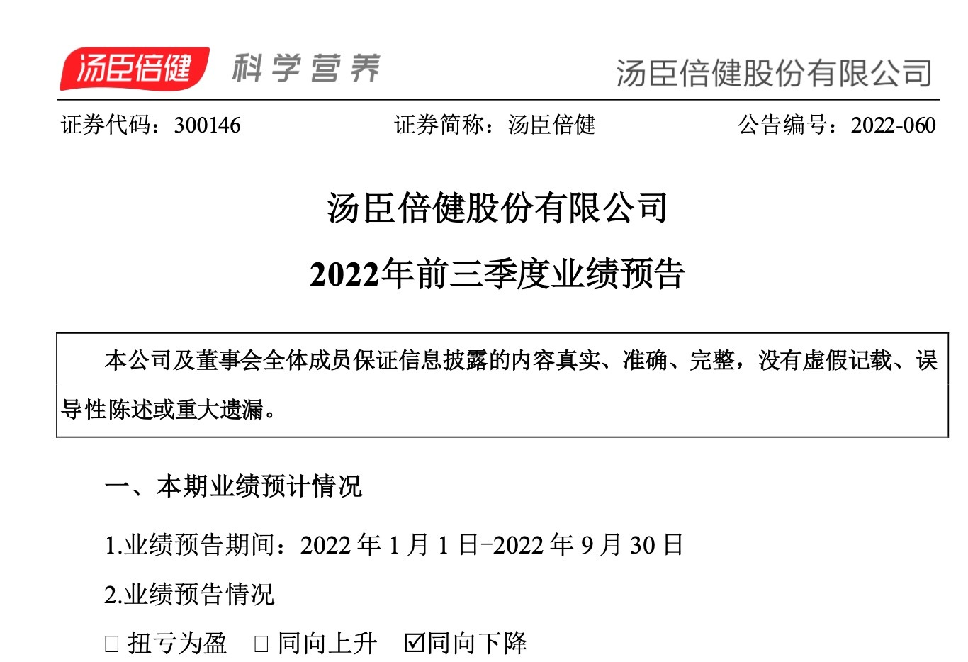 膳食营养补充剂知名企业汤臣倍健近日发布了2022年前三季度业绩预告,预计期内实现归属于上市公司股东的净利润14.13亿元至15.00亿元,同比下降9.77%至15.03%。净利下滑的态势在下半年有所改善——数字显示,第三季度归属于上市公司股东的净利润为3.65亿元至4.52亿元,同比增长25%至55%。