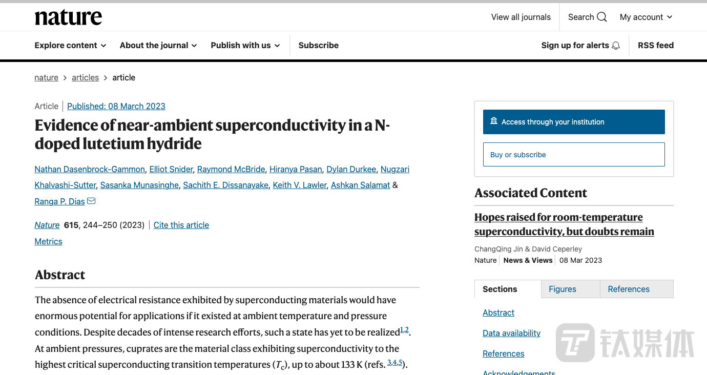 同时,3月9日凌晨,该研究成果发表在英国《自然》杂志上,题目为《N 掺杂氢化镥中近环境超导性的证据》。时间戳显示,这篇论文在2022年8月投出,今年1月18日被Nature接收。