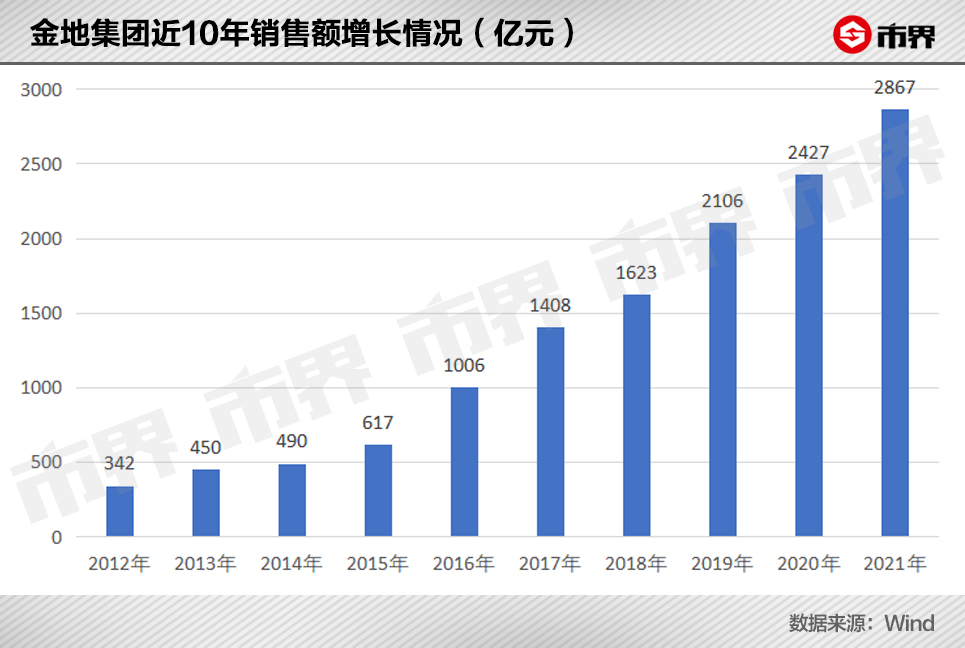 Wind数据显示,金地营收自2017年的376亿,迅速上涨到了2021年的992亿,涨幅高达163%;销售额在2016年突破1000亿大关,2021年暴涨至2867亿。金地终于回到房地产企业销售排行榜前十。
