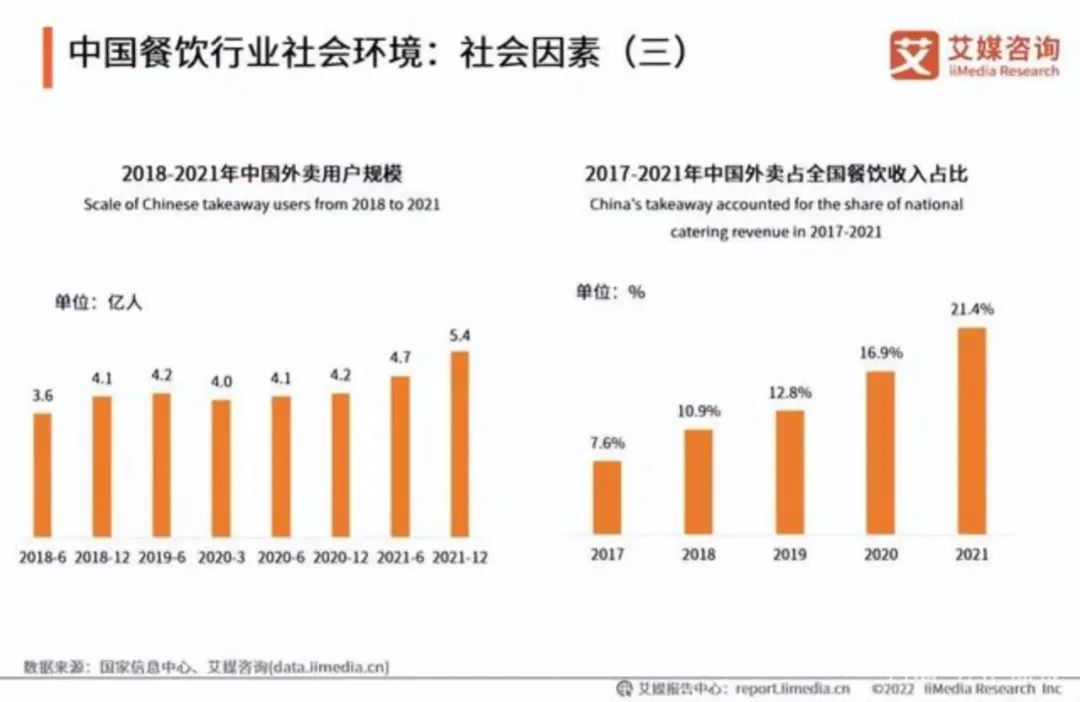 在本地生活业务中,外卖是最大的一块蛋糕。艾媒咨询的报告显示,2022年外卖用户的规模人数和外卖收入在餐饮总收入的占比不断增长。截止到2021年底,外卖用户的规模从2018年的4.1亿人增长至5.4亿人,外卖收入的占比增长到餐饮总收入的21.4%。