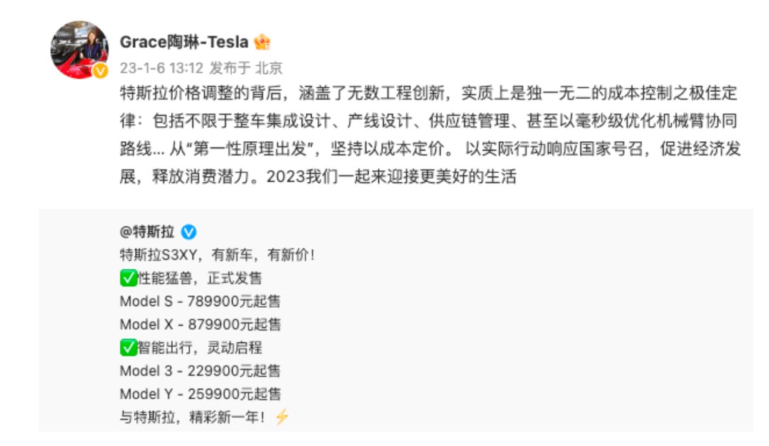 特斯拉对外事务副总裁陶琳发布微博称,“特斯拉价格调整的背后,涵盖了无数工程创新,实质上是独一无二的成本控制之极佳定律:包括不限于整车集成设计、产线设计、供应链管理、甚至以毫秒级优化机械臂协同路线… 从‘第一性原理出发’,坚持以成本定价。”