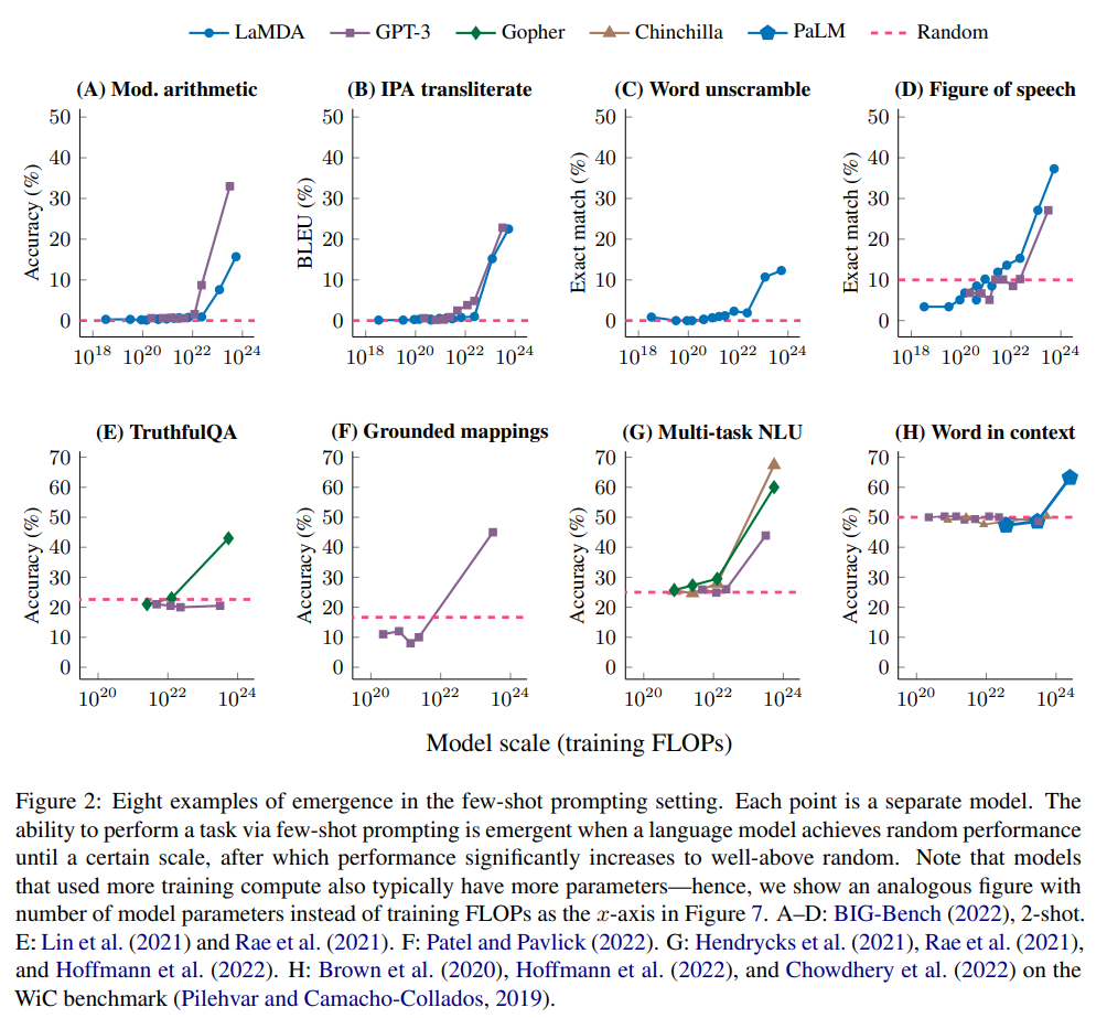 目前这一能力通常在百亿、千亿级别的参数区间出现。“但具体多少参数能够出现涌现现象,也与具体任务、具体模型有关,某些任务13B规模即可,有些任务需要540B,大部分要达到70B。”新浪新技术研发负责人张俊林提到。