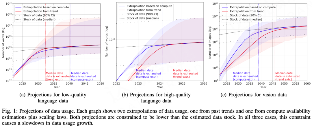 有研究预计,互联网上可用的数据资源很有可能会被耗尽,其中高质量的语言数据大约在2026年耗尽,低质量语言数据大约在2050年耗尽,视觉图像数据也将在2060年耗尽。